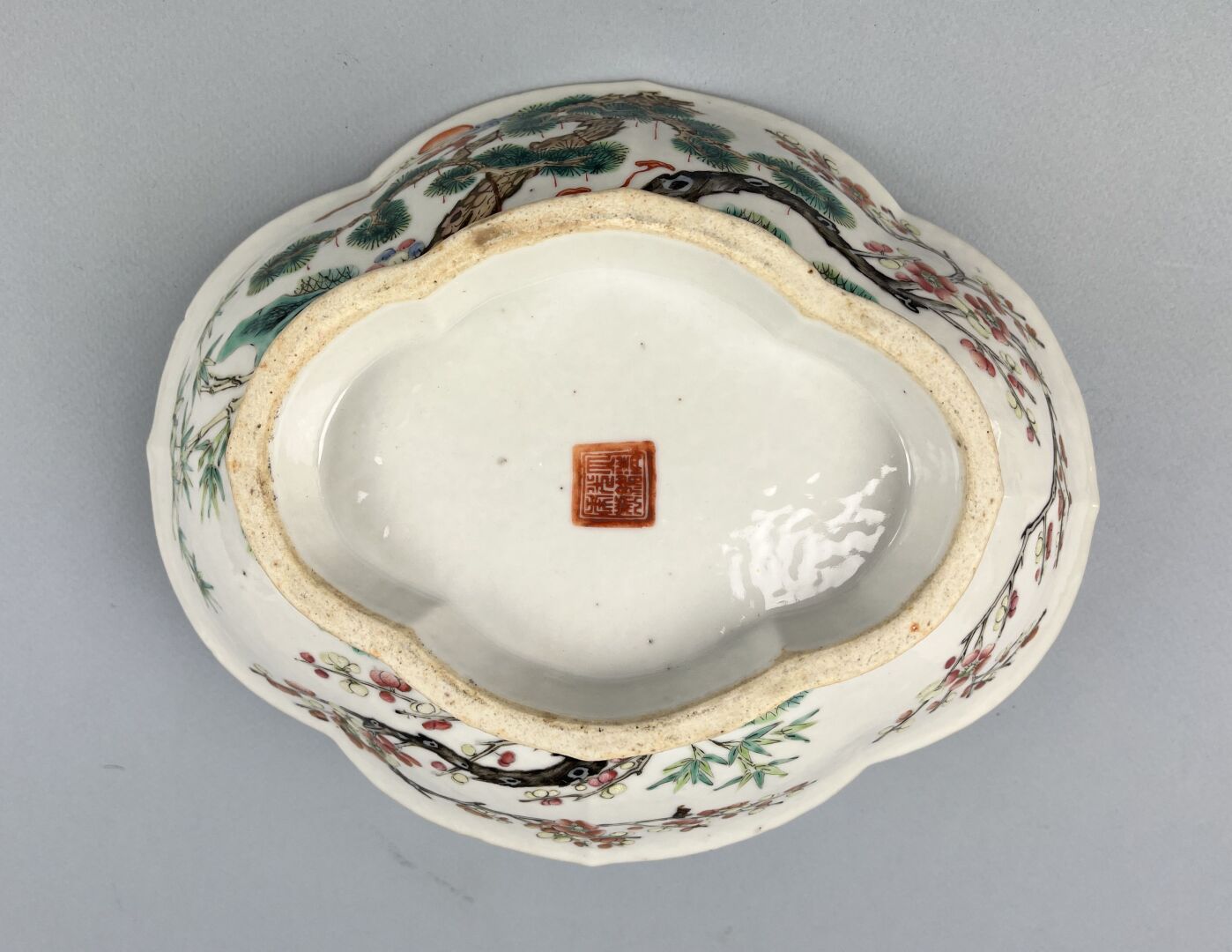 283 RÉSULTAT: 120 € ESTIMATION: 150 / 250 € Jatte quadrilobée en porcelaine à décor de prunus et de pins Chine, fin XIX°, début XX°