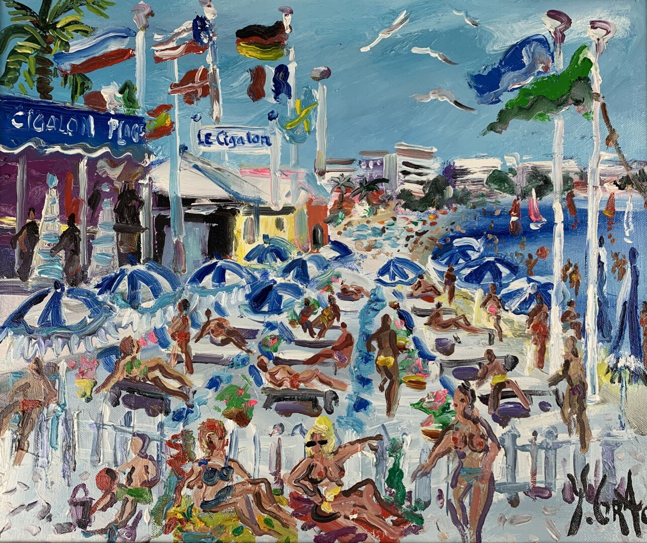 250 ESTIMATION: 700 / 800 € Yvon GRAC (1945), Ecole de Nice « Plages du cigalon à Cagnes sur Mer » Huile sur toile signée en bas à droite et contresignée au dos 38 x 46 cm