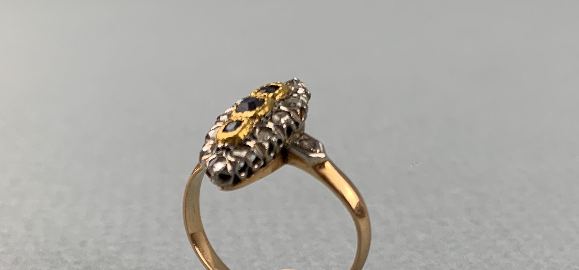 67 RÉSULTAT: 150 € ESTIMATION: 75 / 100 € Bague navette en or jaune (750 millièmes) sertie de petits diamants taillés rose et de trois saphirs calibrés sertis clos Poids brut : 3.2 g. Tdd : 51