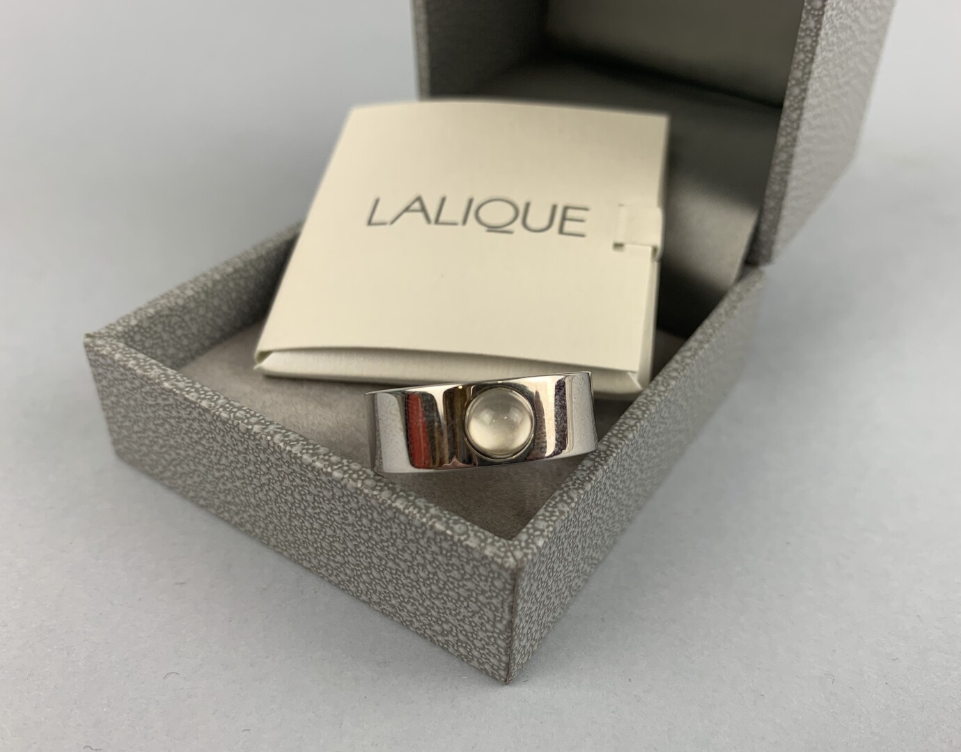 77 RÉSULTAT: 80 € ESTIMATION: 40 / 60 € LALIQUE – Bague modèle « Mossi » formée d’un bandeau en argent (925 millièmes) centrée d’un cabochon de verre opalescent TDD : 64 Dans son écrin