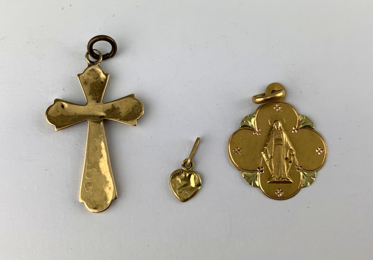 95 RÉSULTAT: 55 € ESTIMATION: 50 / 70 € Ensemble de trois pendentifs en or jaune et rose (750 millièmes), un coeur, une croix gravée et une médaille de la Vierge gravée GB 1921, une bélière en métal Poids : 2,2 g