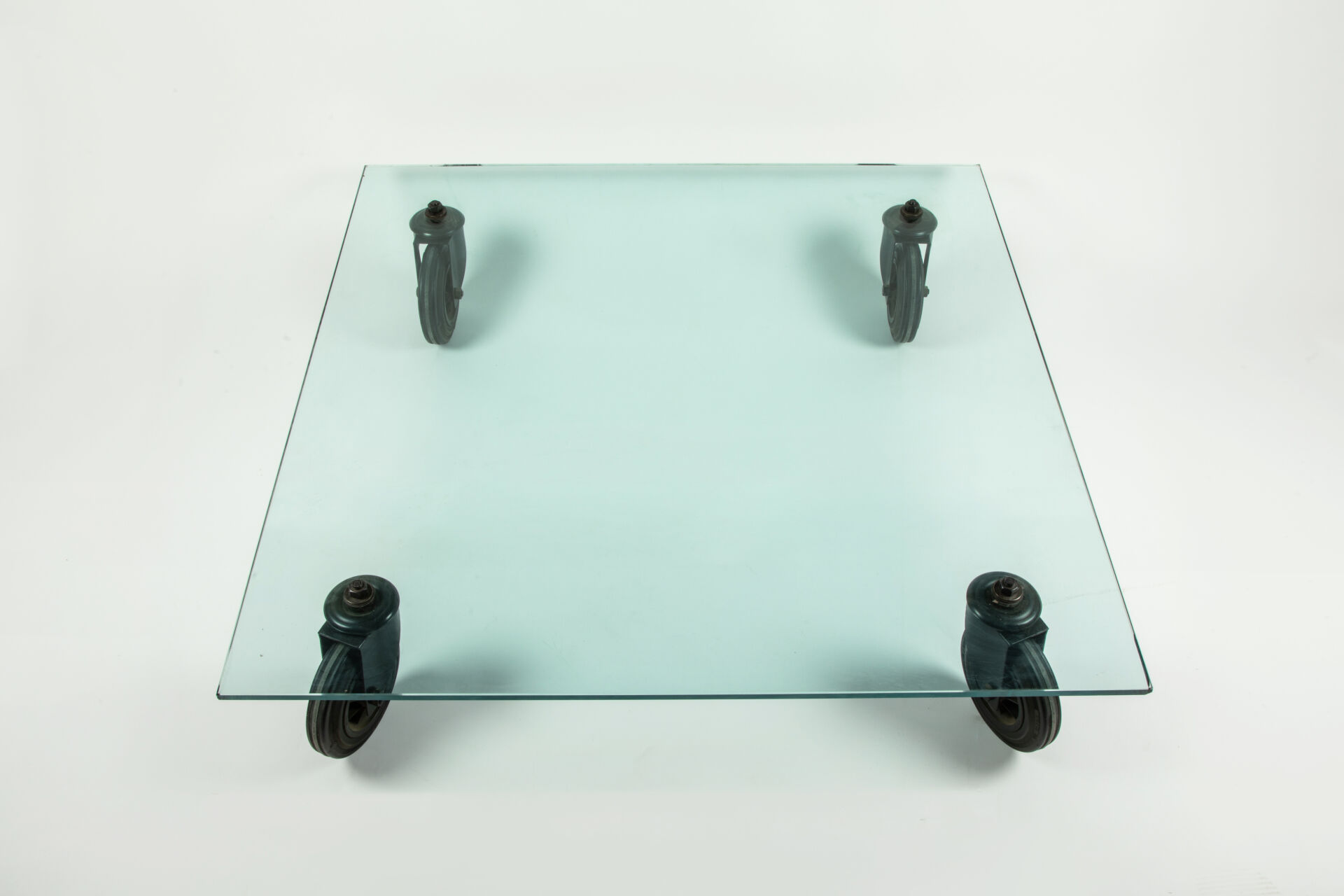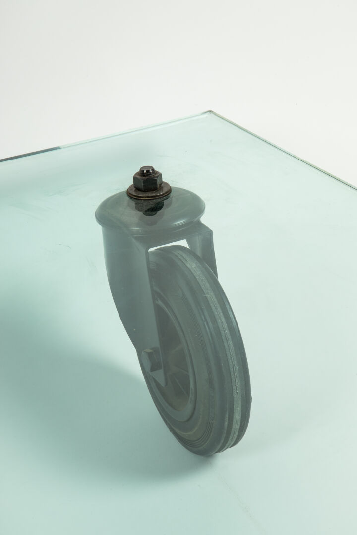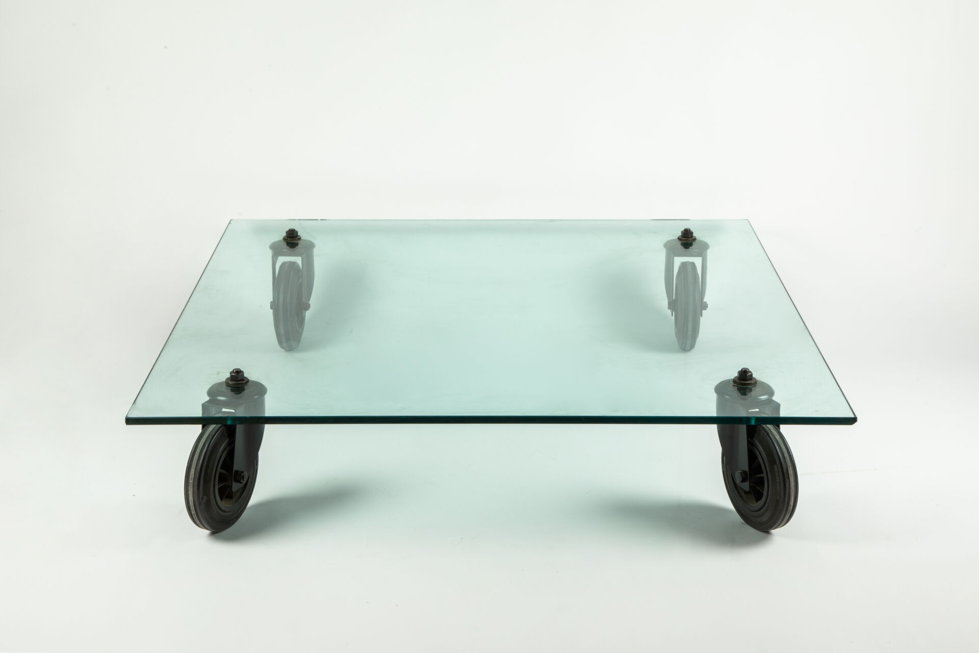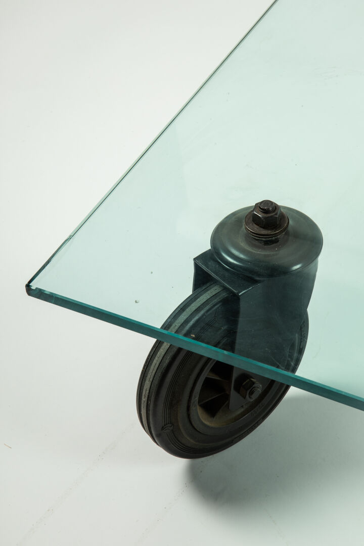 Table basse modèle « Tavolo con Ruote », à plateau en verre rectangulaire reposant sur quatre importantes roulettes en acier laqué noir et caoutchouc