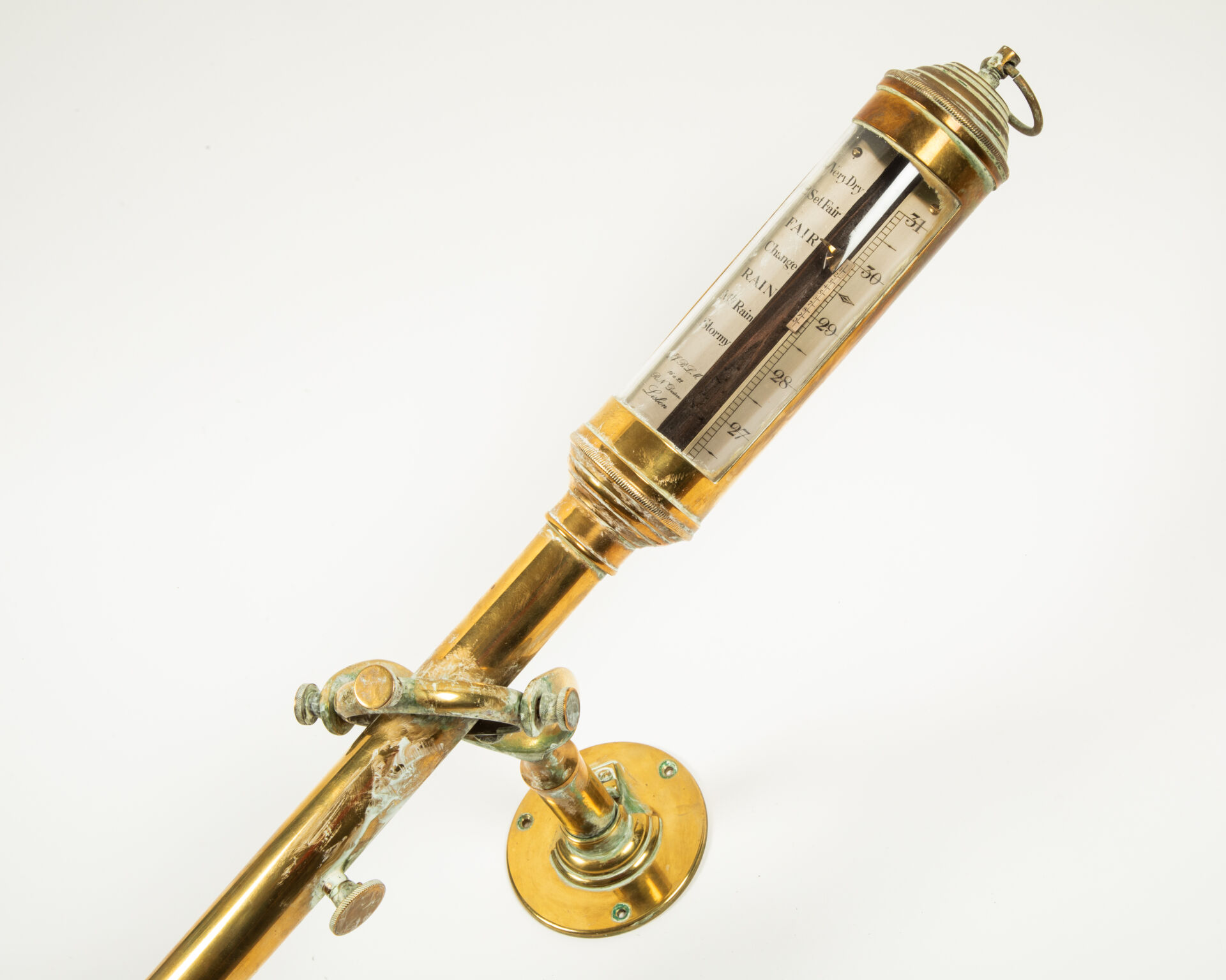 Baromètre-thermomètre de bord à la Fortin en bronze et laiton. Bras articulé, cadran métallique