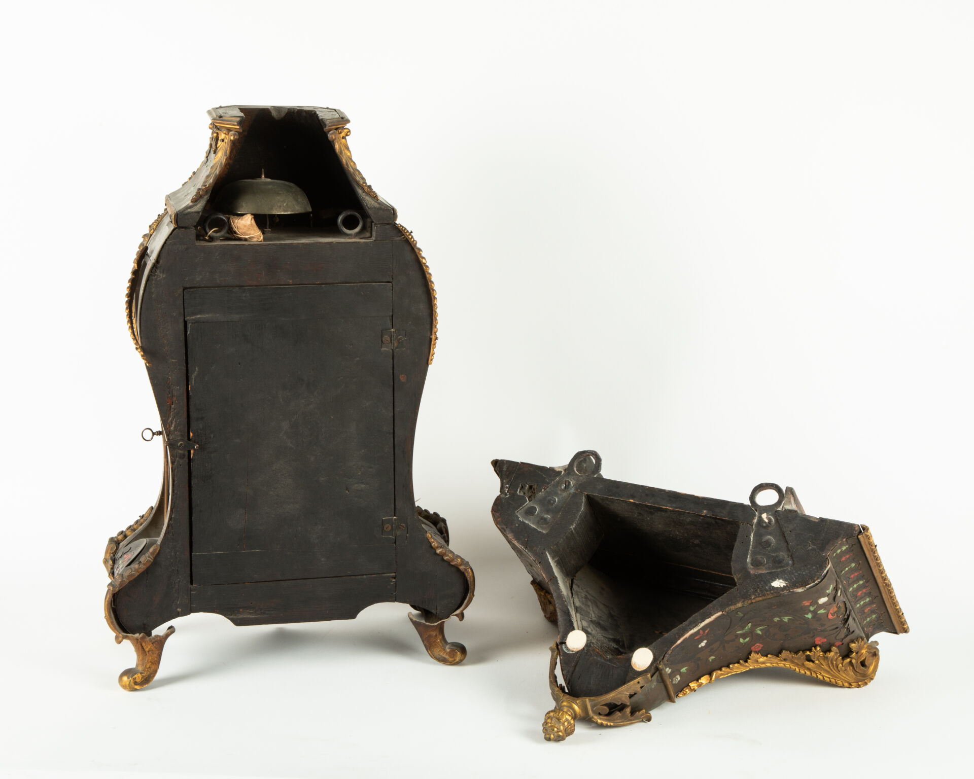 Cartel d’applique et sa console en marqueterie dite Boulle d’écaille, nacre et bois teinté, en contrepartie sur fond de laiton, riche ornementation de bronze doré à décor d’oiseaux, de frises végétales, coquilles et allégories des arts et de la guerre, cadran à treize cartouches émaillés signé MYNUEL à Paris