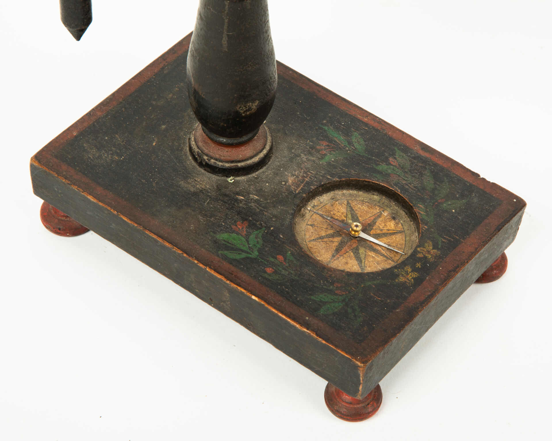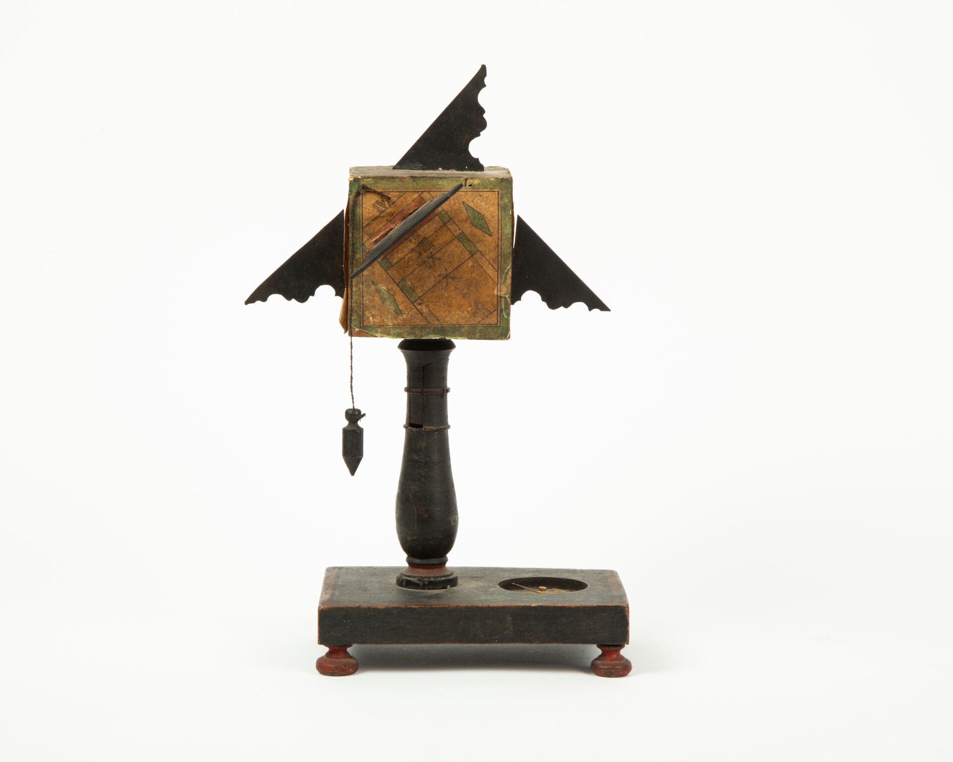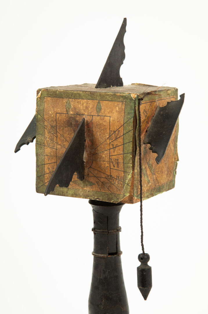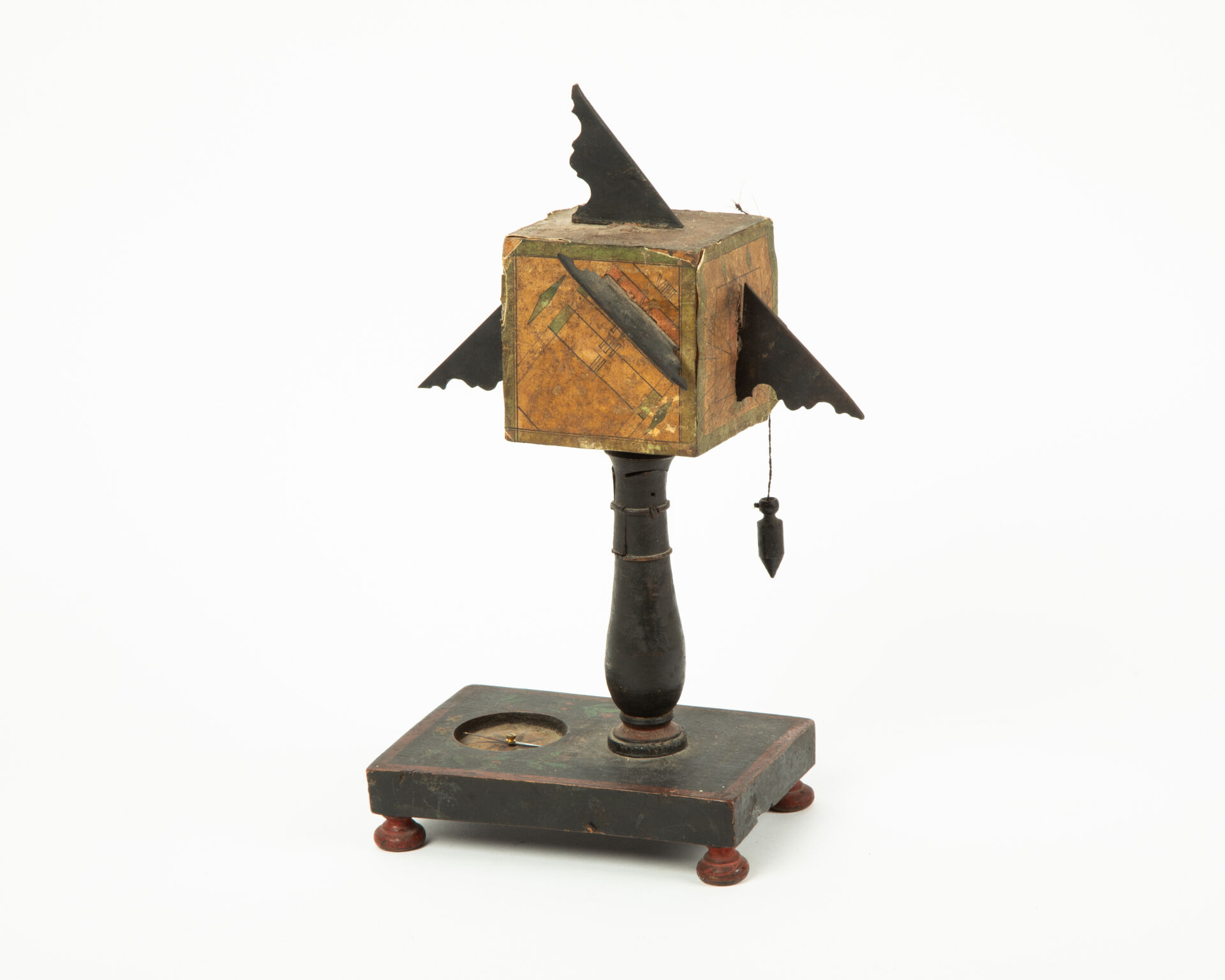 Cadran solaire portatif en bois de style Beringer composé de 5 cadrans sur le cube et d’une base avec une boussole, fil de plomb suspendu à une face. Le tout est à décor de feuillages peints sur du papier.
