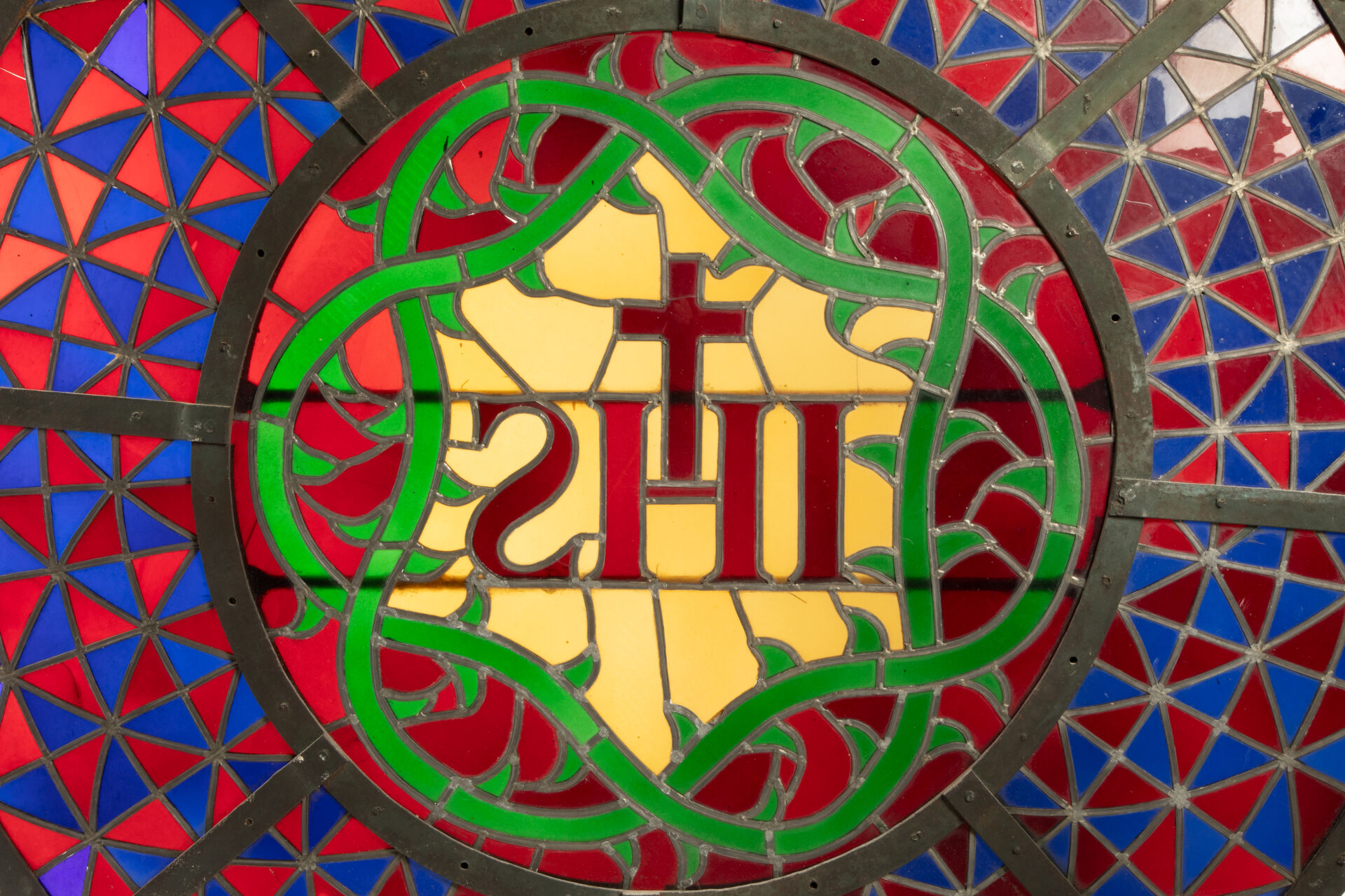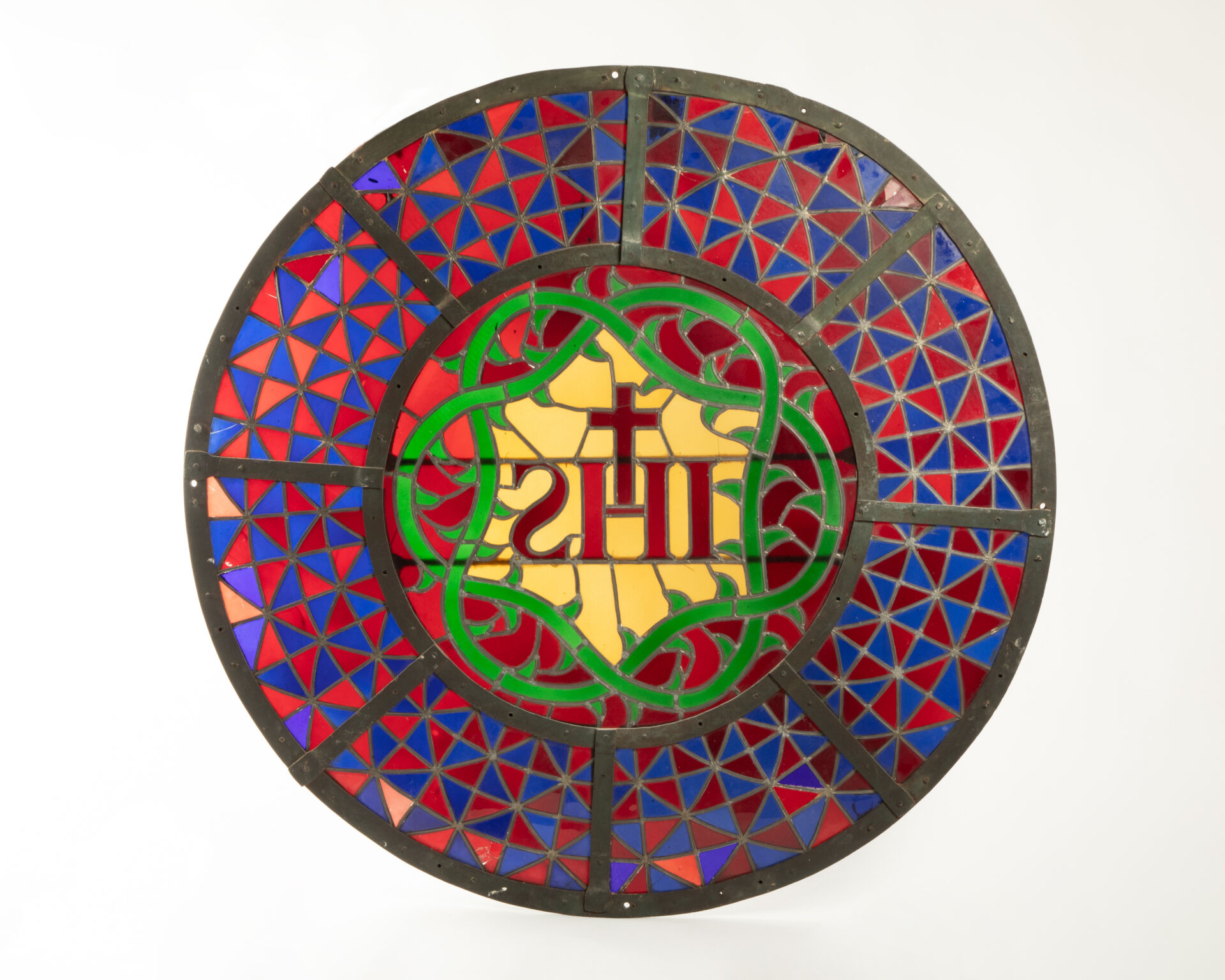 Rosace en vitrail, verres et plomb, motif central IHS sommé d’une croix dans une couronne d’épine