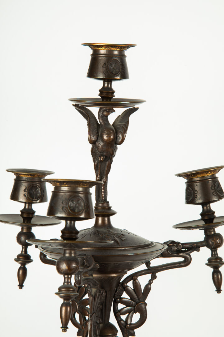 Importante garniture de cheminée en bronze à patine médaille comprenant une pendule borne, figurant une jeune femme à l’antique pensive se reposant sur une colonne intégrant le cadran, une paire de cassolettes figurant des coupes à décors de profil féminin à l’Antique et une paire de candélabres à quatre lumières à décor d’oiseaux chimériques, fût bagué à décor de profils féminins à l’Antique, piètement tripode à décor de pattes de lion.