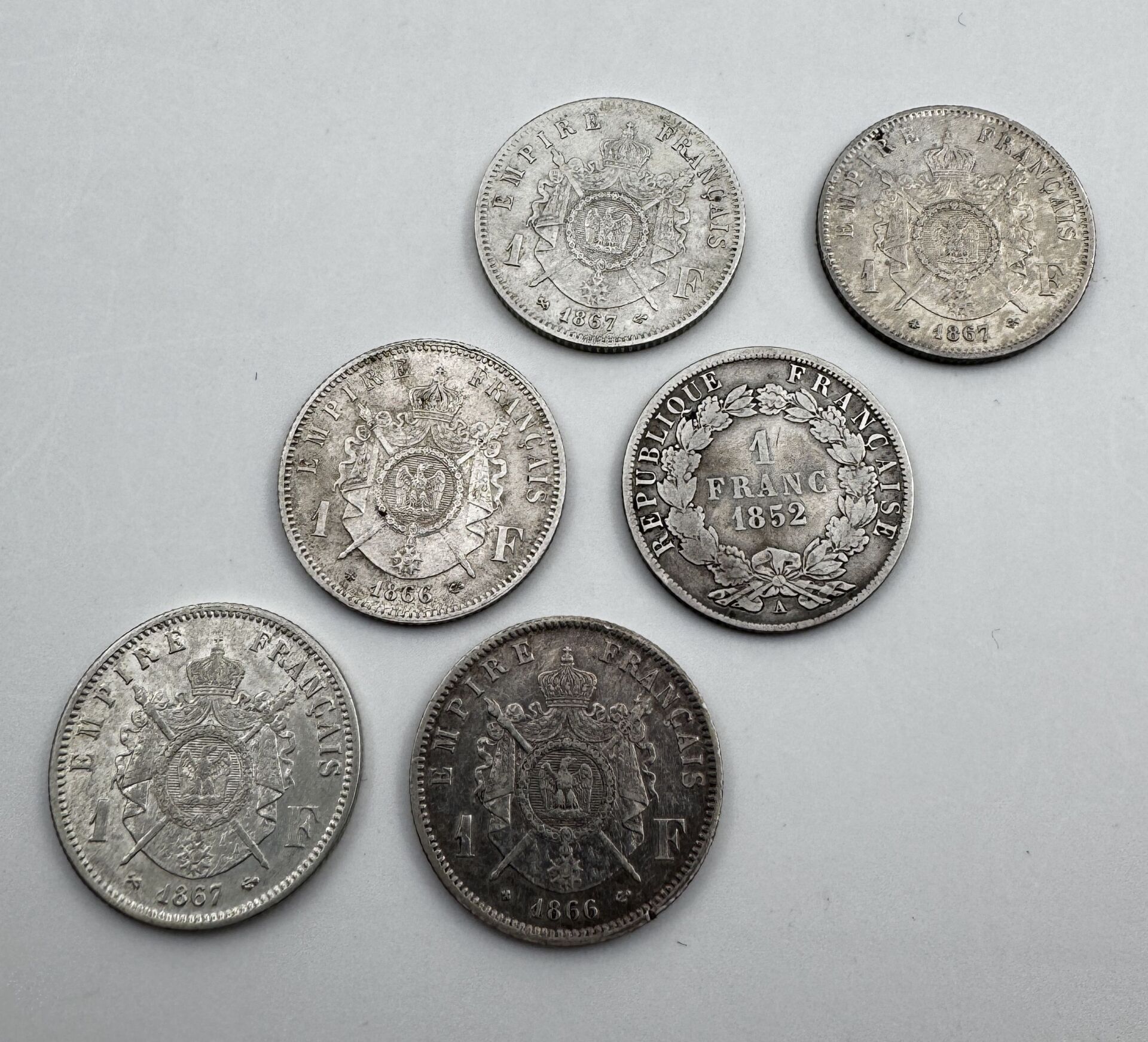 NAPOLEON III – Lot de six pièces de un franc argent dates et ateliers variés