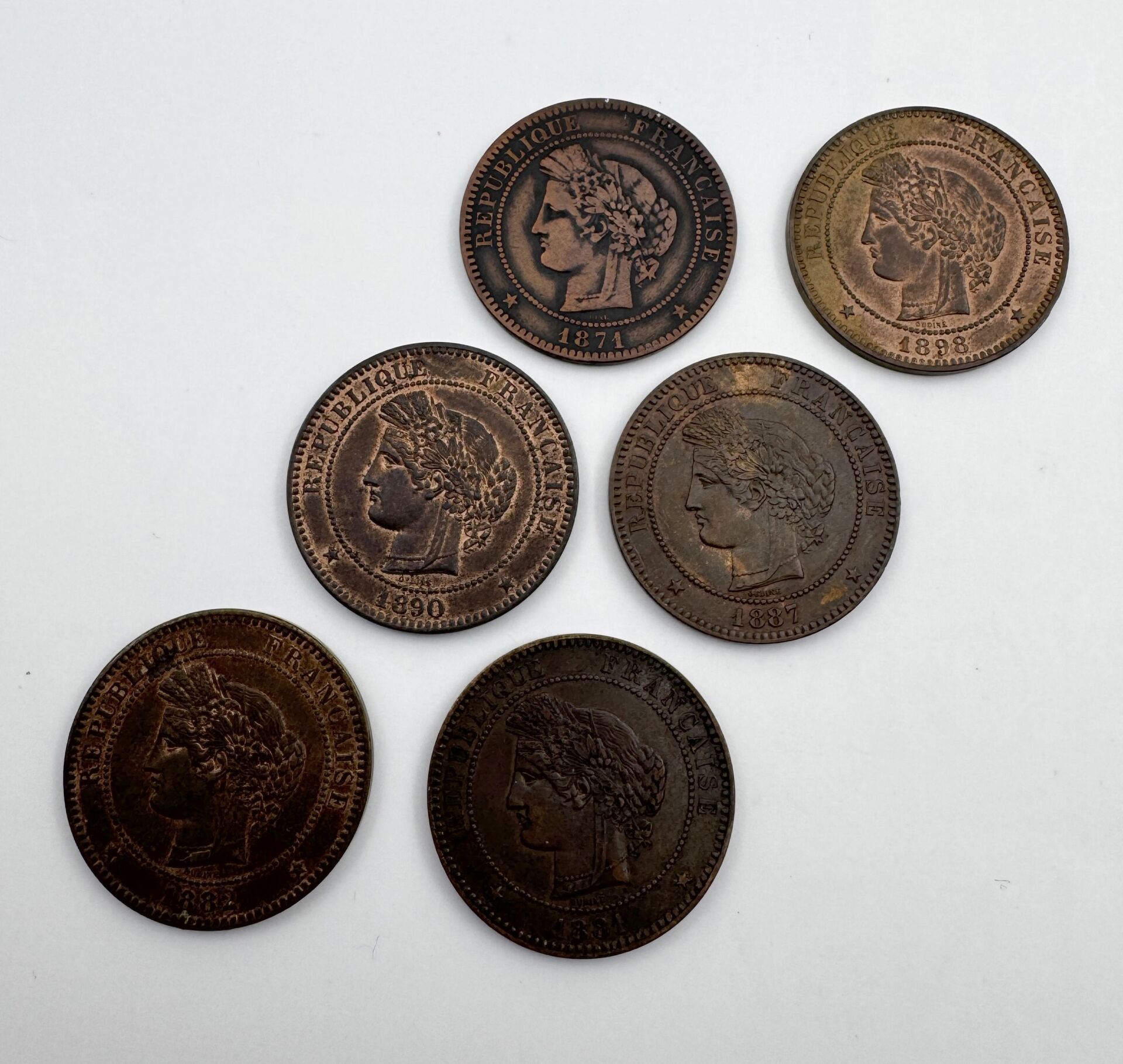 CERES – Lot de six pièces de dix centimes dates différentes dont une 1871 K