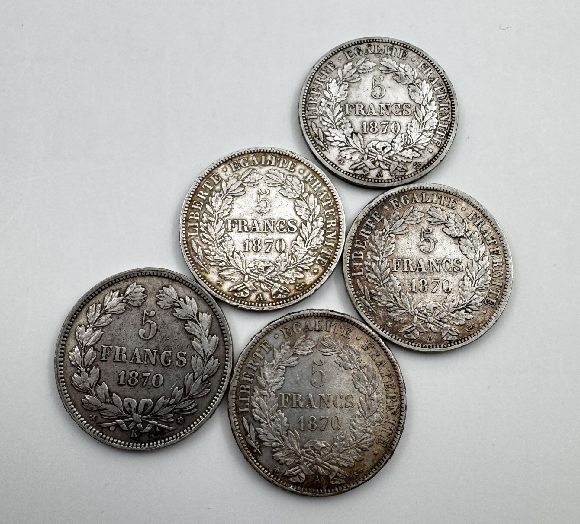 Lot de cinq pièces de cinq francs Cérès argent 1870