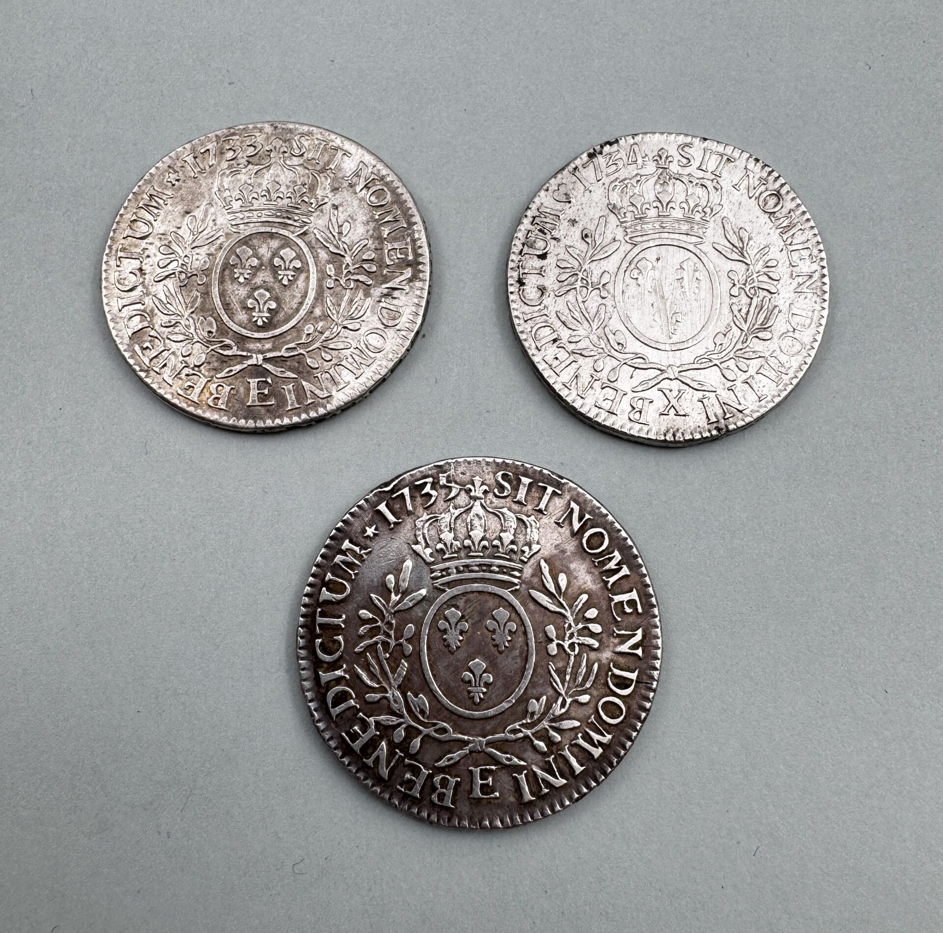 ROYALE – Louis XV lot de 3 écus argent aux branches d’olivier 1733 1735 E Tours 1734 X Amiens