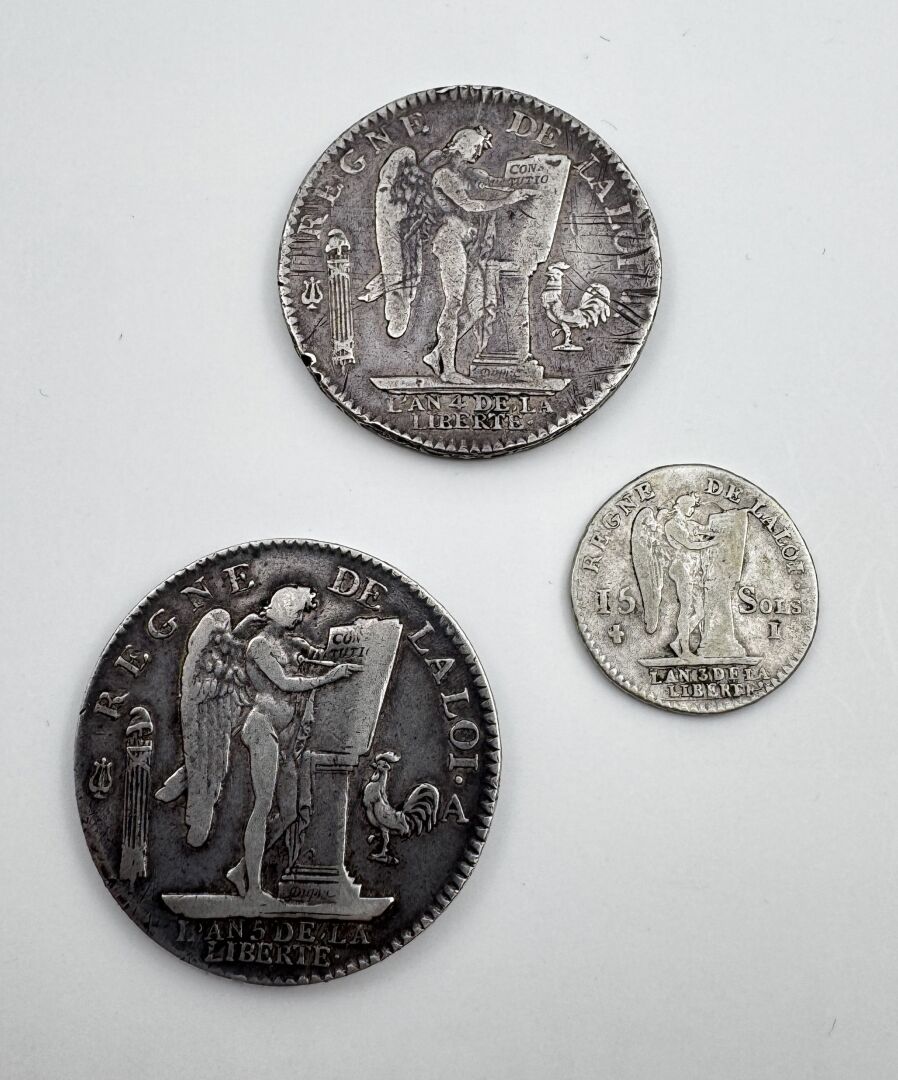 REVOLUTION / CONSTITUTION – Lot de trois monnaies deux écus argent de six livres 1792 et 1793 et un quinze sols Limoges