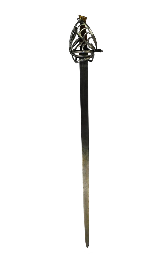 Belle Schiavone, vers 1670. Lame plate symétrique à gorge de 870 mm de long. Garde fer en panier, nombreuses branches de garde formant une protection idéale pour la main à cette époque où le gantelet d’armure disparut, on affecta le rôle de protection de la main à la garde très complexe de ce genre d’arme typique de la Sérénissime. Pommeau typique en bronze fondu en tête de chat, décor perlé en relief central, fusée en bois cordée (postérieurement) terminée par deux viroles tressées en filigrane.