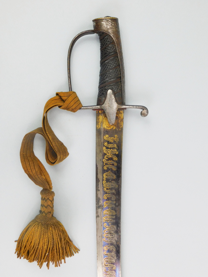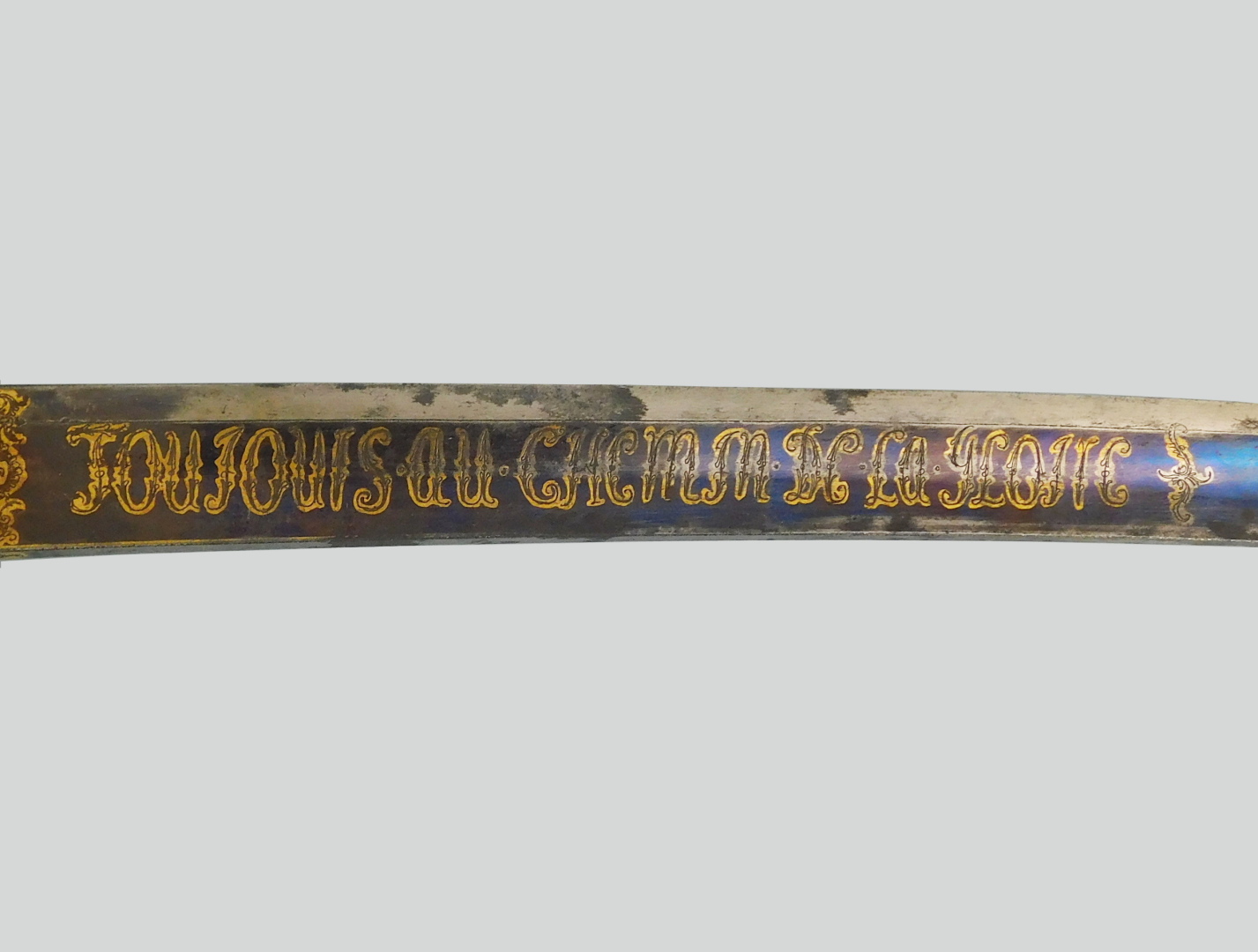 Extraordinaire sabre d’officier de l’armée des émigrés, belle lame à la Montmorency de 680 mm de long et 400 mm de large, cravate rouge d’origine. Belle gorge portant un extraordinaire marquage occupant la moitié de la longueur en Lettres dorées à l’or moulu sur fond bleu d’eau « Fidèle à dieu, au roi et à l’honneur » sur une face et la fière devise « toujours au chemin de la gloire » sur l’autre face. Dos plat, ricasso doré à terminaison en accolade et décor d’un semi d’étoiles cantonné dans un quadrillage. Arme montée fer, calotte plate à longue queue à bords ourlés, bouton de rivure losangique proéminent. Branche de garde unique, centre concave, deux filets gravés joignant à angle droit la branche de croisière. Oreillon losangique concave, quillon à terminaison en crosse plate. Fusée bois sombre (fente), large quadrille en spirale alterné d’un double filigrane. Dans son fourreau en cuir noir cousu. Trois garnitures fer découpées en accolade, deux anneaux fer soudés sur piton sur chape et bracelet intermédiaire.
