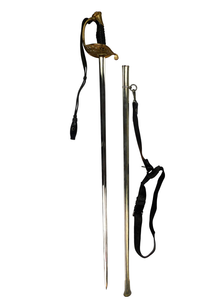Sabre d’officier à section lenticulaire à deux gorges décalées, type 1882, fourreau tôle d’acier nickelé, monture en bronze fondu à décor floral type 1845 d’adjudant. Calotte à courte queue à frise florale, fusée corne à double filigrane un peu lâche. Dragonne cuir, ceinturon noir.