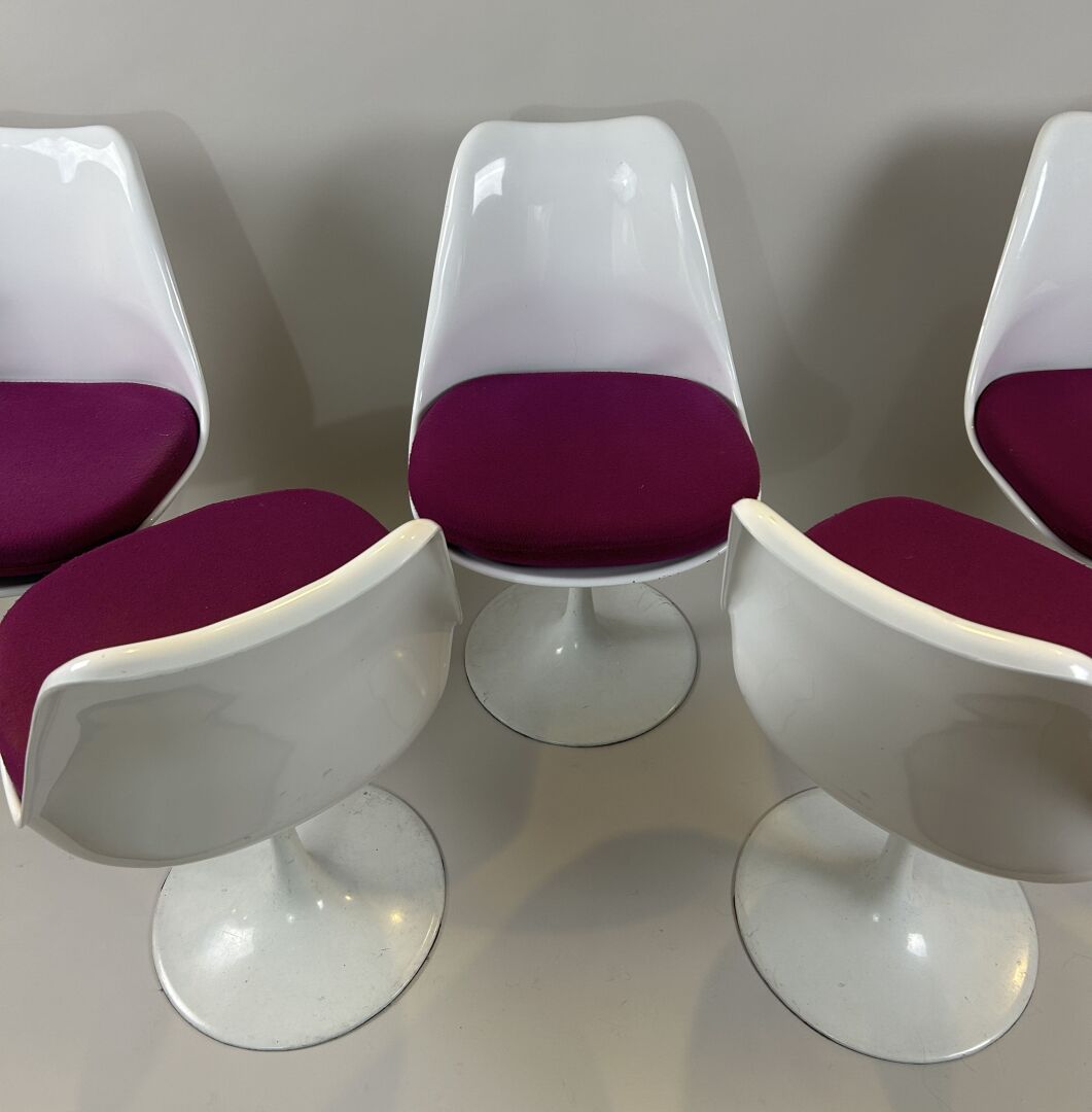 144 RÉSULTAT: 850 € ESTIMATION: 300 / 400 € Eero SAARINEN, d’après Huit chaises, modèle tulip, à coque moulée en fibre de verre reposant sur un piétement tulip en fonte d’aluminium laqué blanc, galettes de tissu rose H : 79 cm