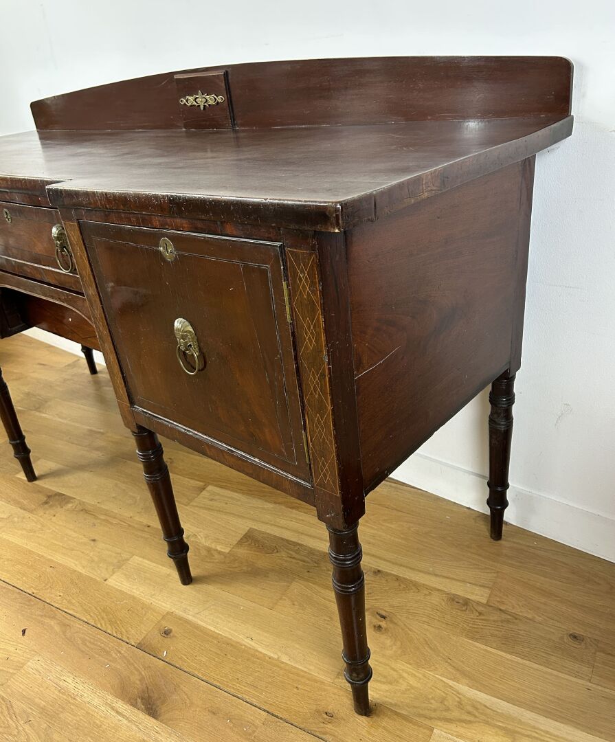Buffet de présentation en acajou et placage d’acajou ouvrant par trois tiroirs, dont un grand et un dissimulé et une porte, incrustation de filets de bois clair à décor géométrique, garnitures de bronze postérieures à décor de tête de sphinx annelées, reposant sur six pieds fuselés bagués