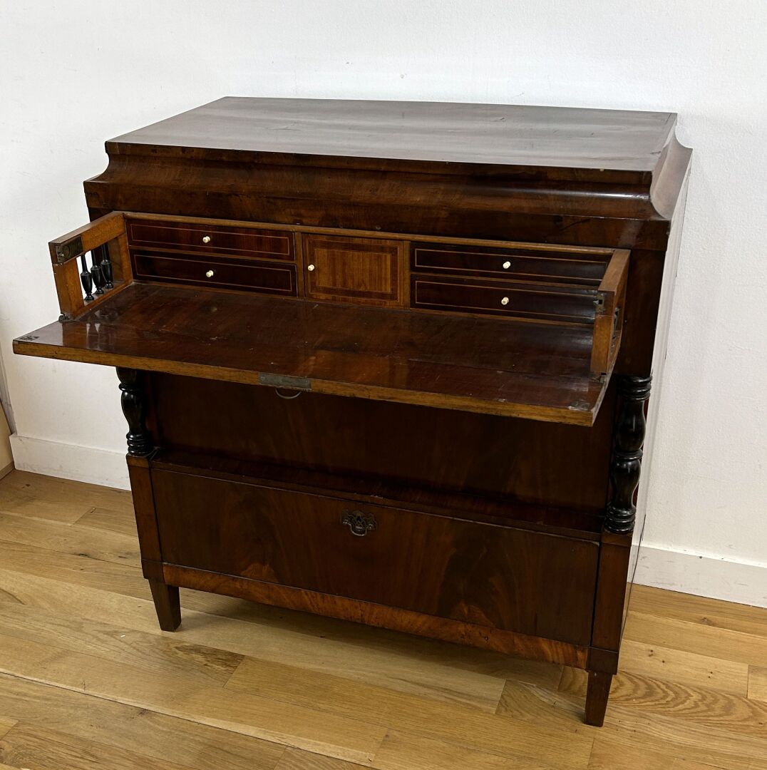 Secrétaire d’appoint en acajou et placage d’acajou ouvrant par trois tiroirs, le premier à abattant formant scriban dévoilant quatre tiroirs et une petite porte dans un entourage de balustrades de bois noirci, second tiroir en léger retrait à encadrement de colonnes dégagées reposant sur quatre pieds gaine