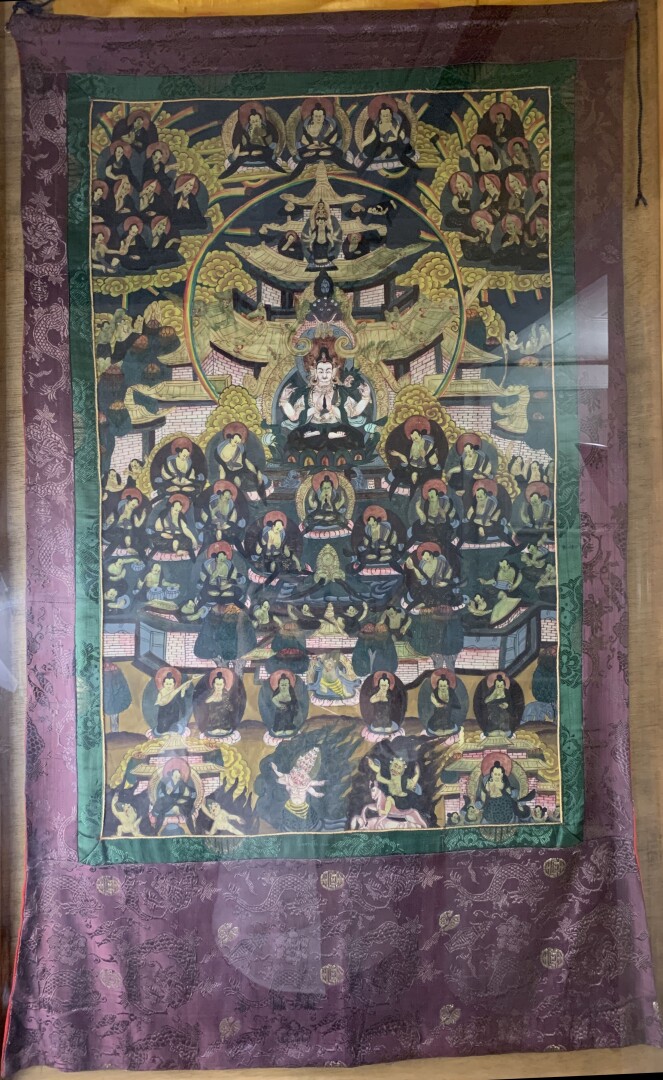 133 RÉSULTAT: 100 € ESTIMATION: 100 / 200 € Tanka à décor de scènes peintes et brodées sur soie Népal début XX° dans un bel encadrement 109 x 67 cm pour le textile, 135 x 75 cm pour l’encadrement