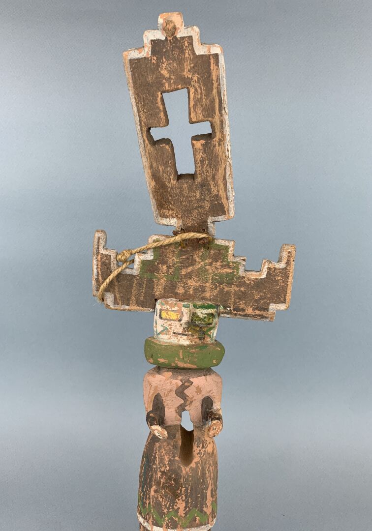 Très étonnante kachina non identifiée arborant un masque heaume surmonté d’une double tabletta à fond noir, crénelée d’escaliers du ciel, la partie supérieure ajourée d’une croix. Le heaume, ourlé d’une collerette verte est peint à fond blanc, les yeux rectangulaires jaunes bordés de noir, la face encadrées d’éclairs d’orage verts.