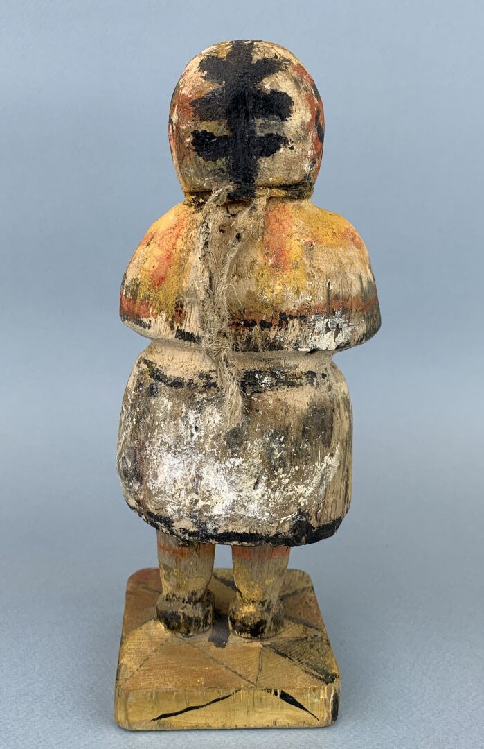 Le fait que le motif soit encore présent bien que modifié tend à confirmer une production ne dépassant pas l’immédiat après guerre. le kilt, blanc est paré d’une écharpe latérale ornée de triangles de couleurs. Le personnage porte généralement une cape sur les épaule, ce qui explique l’absence de bras. Ce kachina a été décrit par Fawkes en 1903.