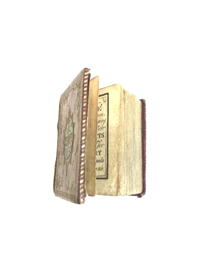 [MINUSCULE]. THE BIBLE IN MINIATURE or a concise History of the Old & New Testaments. London, Newbery, 1780. Fort volume minuscule (32 X 40 mm) maroquin rouge décoré, mosaïque de maroquin vert lierre au centre avec le monogramme doré trilitère IHS du nom de Jésus en grec, tranches dorées (reliure de l’époque) ; 256 pages. Deux pages de titres et QUATORZE GRAVURES sur bois à pleine page hors-texte.