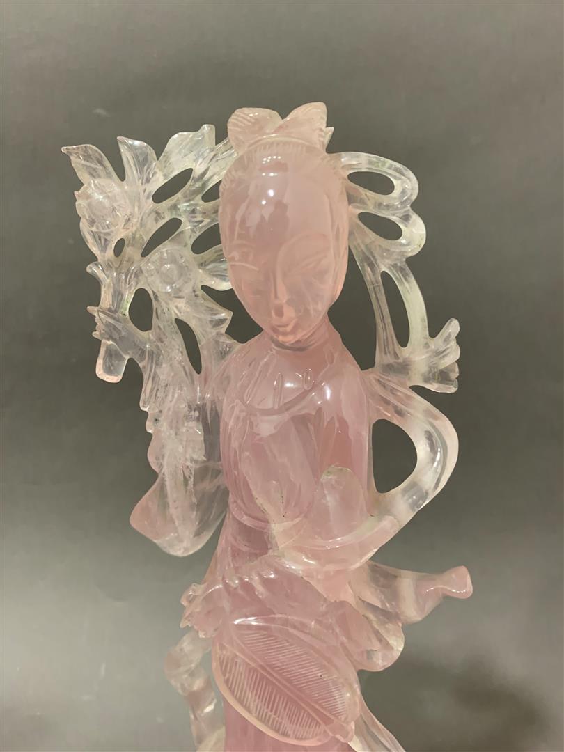 45 ESTIMATION: 150 / 200 € Sujet en quartz rose figurant une dame de qualité tenant un éventail et une branche d’arbre en fleur Socle de bois ajouré Chine XX H : 30 – 27.5 cm