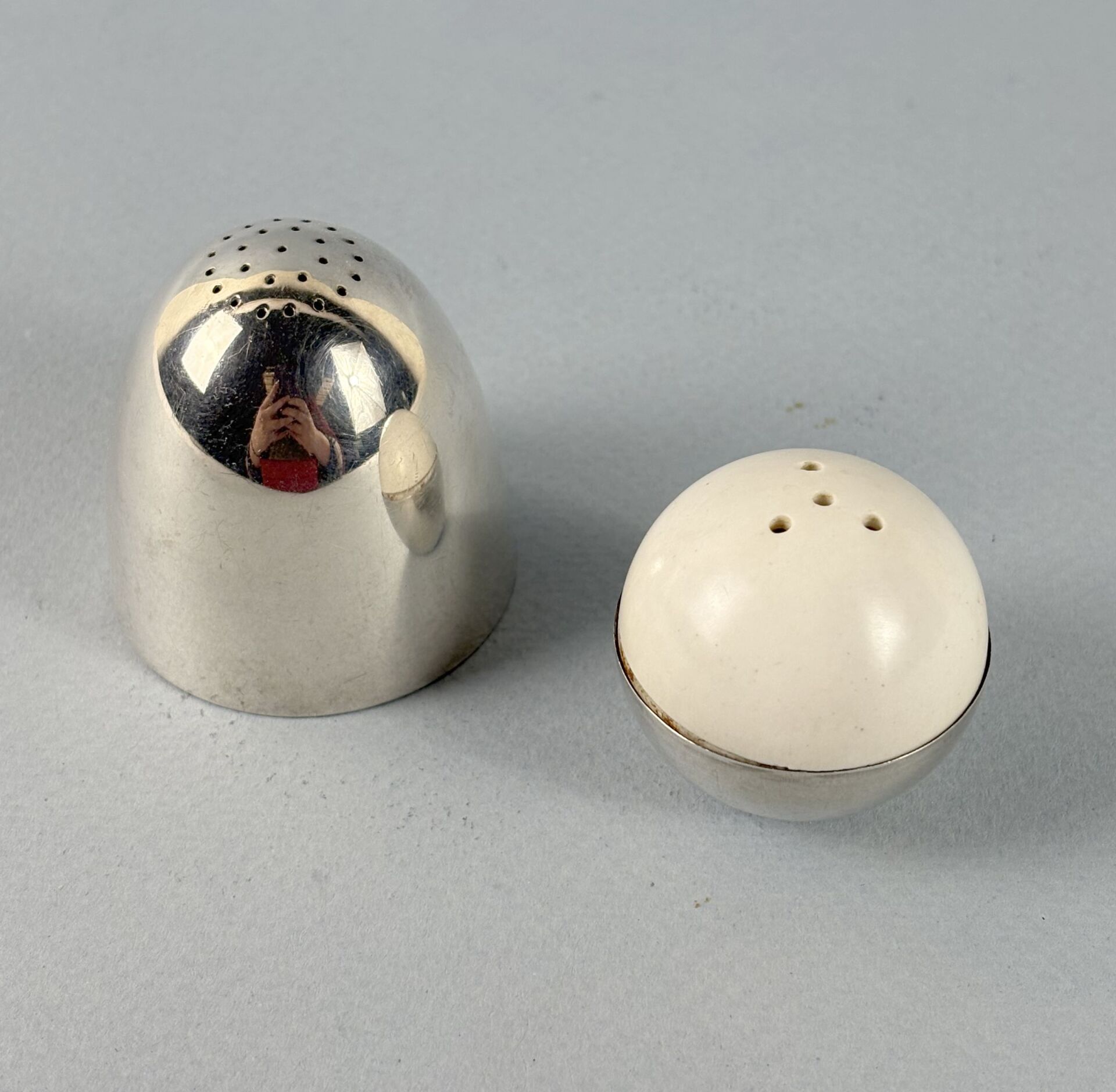 On y joint une petite salière de la même maison en argent (925 millièmes) et plastique blanc