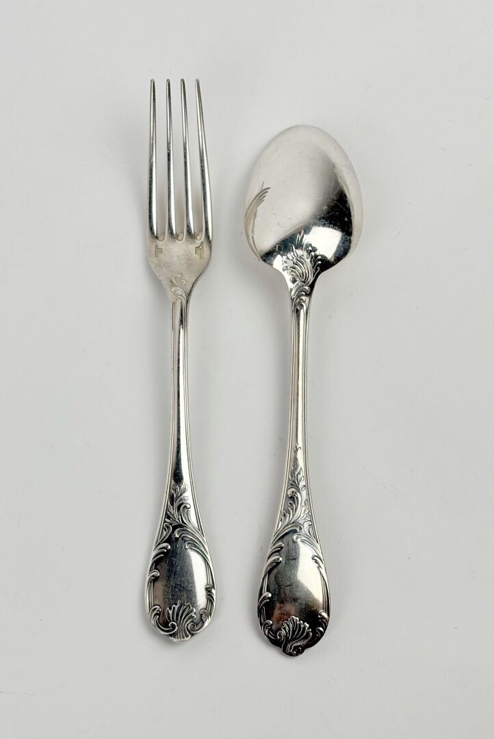 15 ESTIMATION: 240 / 260 € CHRISTOFLE Modèle Marly – Suite de douze couverts de table en métal argenté Certains sous blister