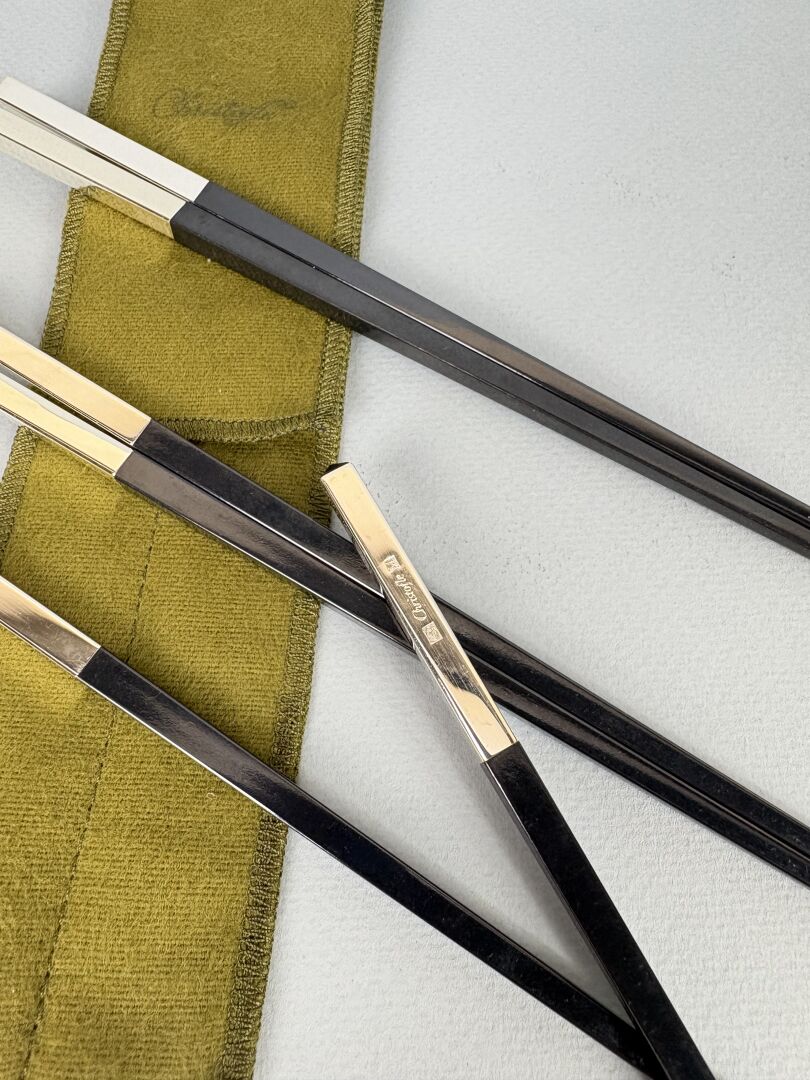 171 ESTIMATION: 80 / 120 € CHRISTOFLE Suite de trois paires de baguettes en métal argenté et laque noire Dans leur housse
