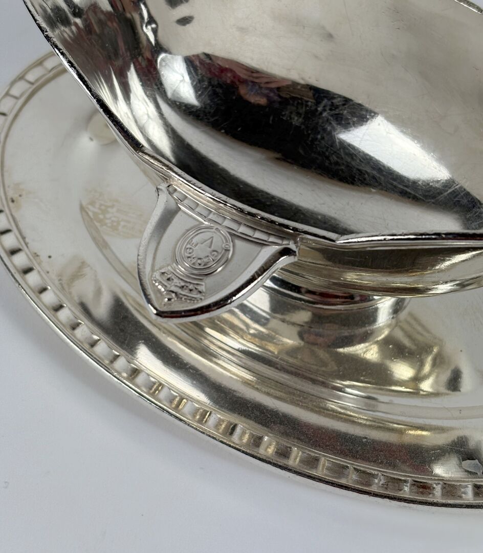 181 ESTIMATION: 40 / 60 € CHRISTOFLE pour l’Hotel Georges V Grande saucière en métal argenté avec son dormant amovible frappée du blason de l’établissement Etat d’usage L : 25 cm