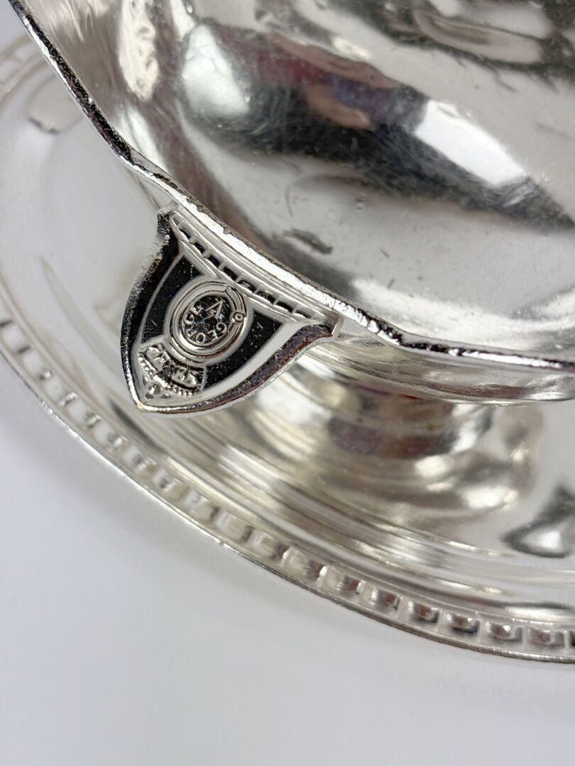 183 ESTIMATION: 30 / 50 € CHRISTOFLE pour l’Hotel Georges V Petite saucière en métal argenté avec son dormant amovible frappée du blason de l’établissement Etat d’usage L : 21 cm