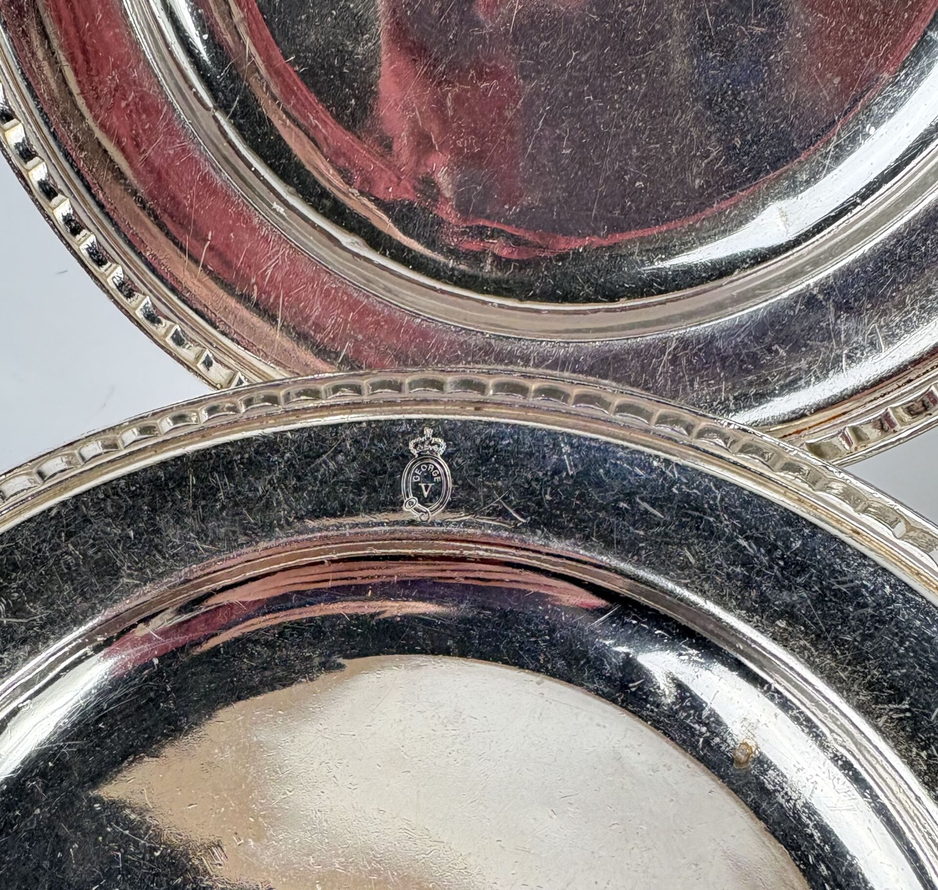 191 ESTIMATION: 60 / 80 € CHRISTOFLE pour l’Hotel Georges V Suite de trois plats ronds en métal argenté frappés du blason de l’établissement Etat d’usage D : 22.5 cm