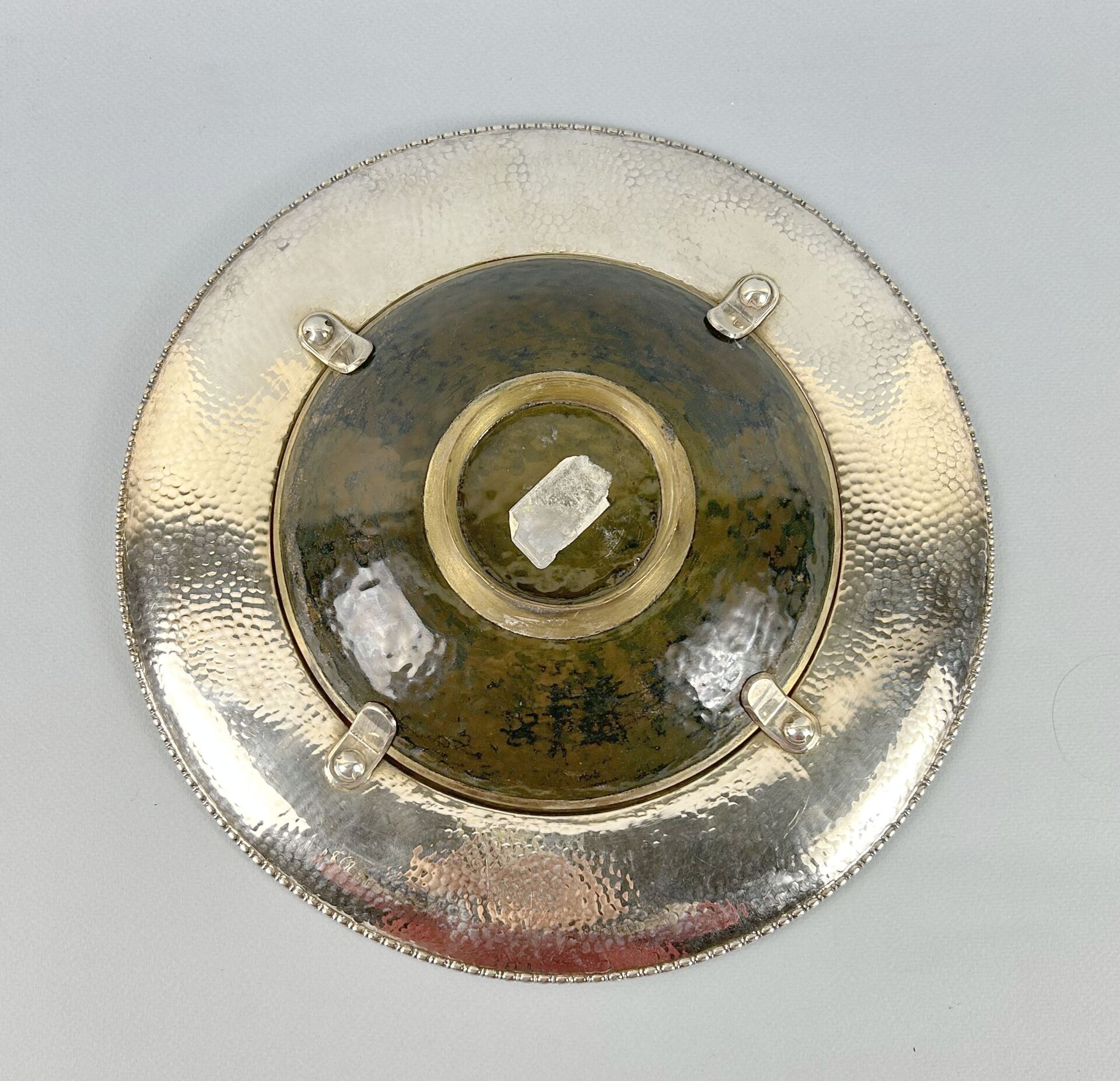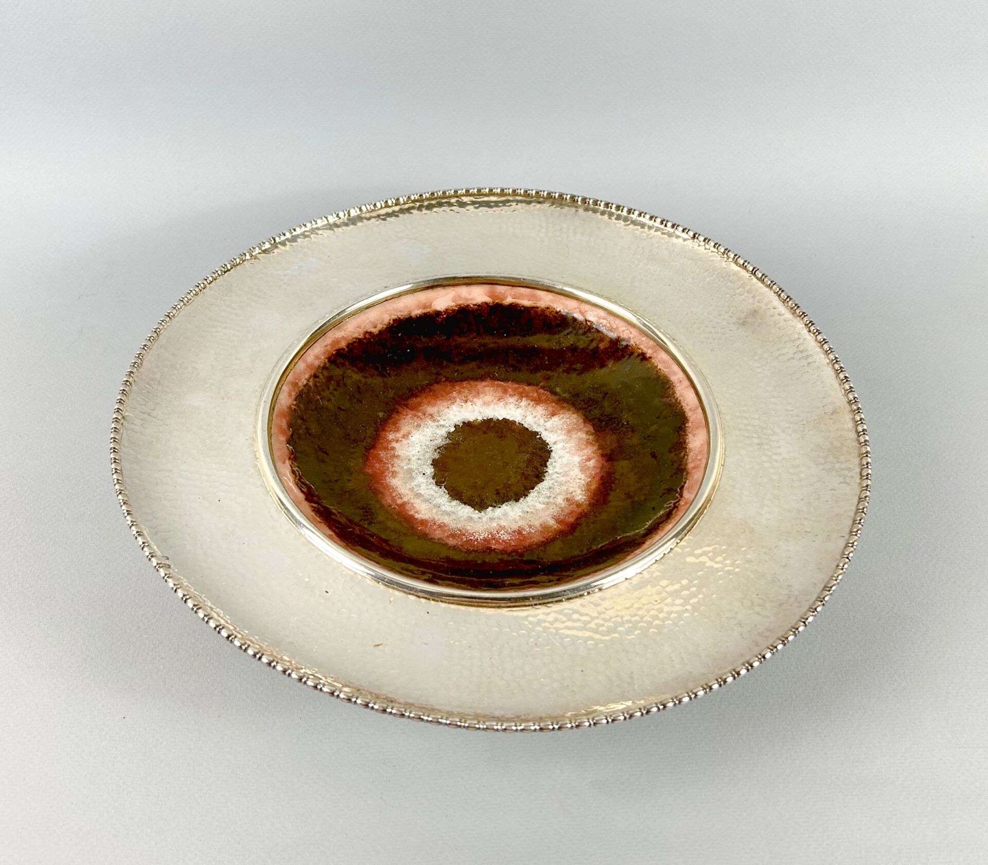 221 ESTIMATION: 100 / 150 € Plat creux en faïence émaillée cerclé d’un important marli en argent martelé Poids Brut : 829 g.