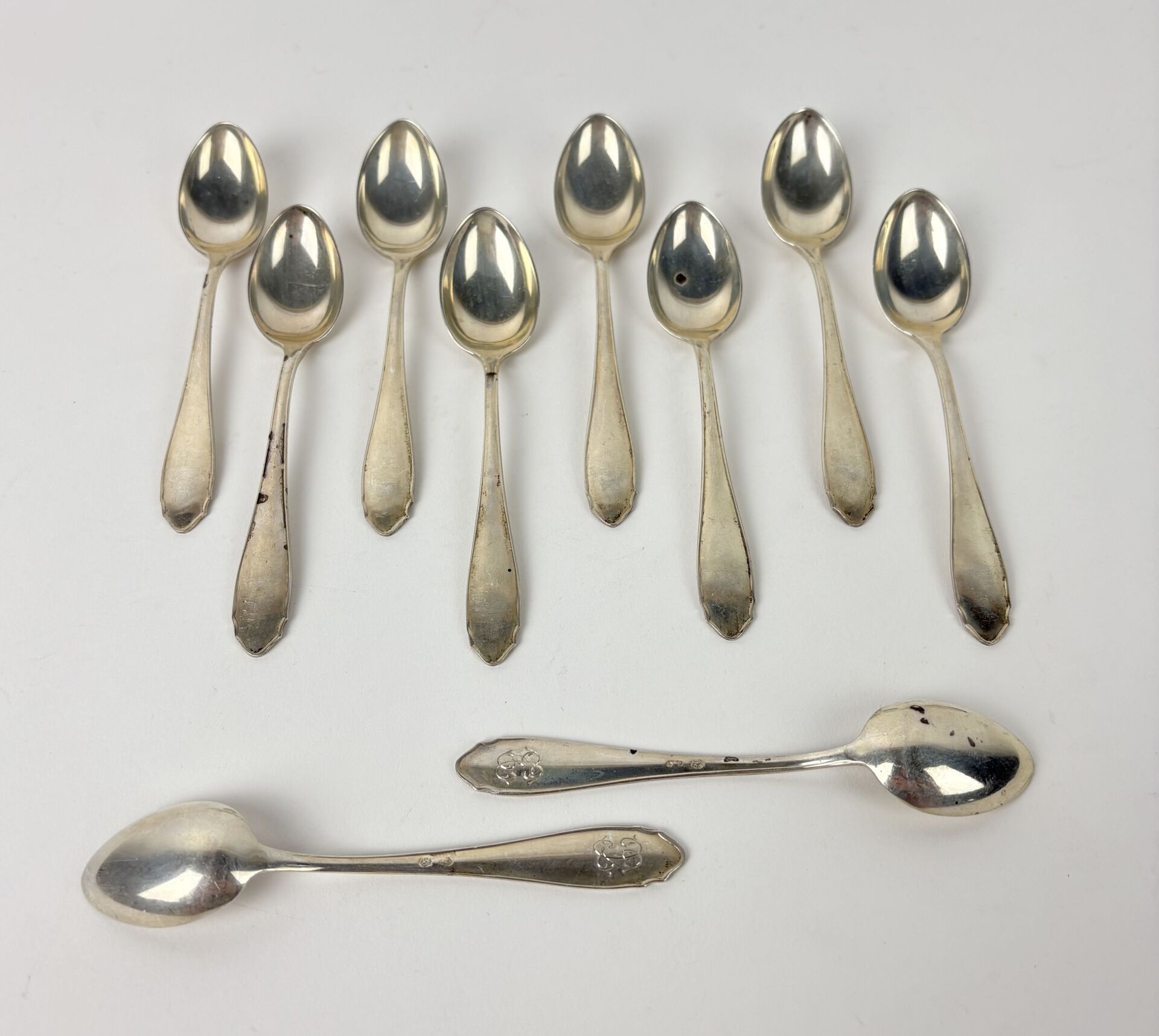 232 ESTIMATION: 60 / 80 € Suite de 10 cuillères à moka en argent étranger (Espagne) à manche violoné à filet et chiffrées « TC » Poids : 133 g