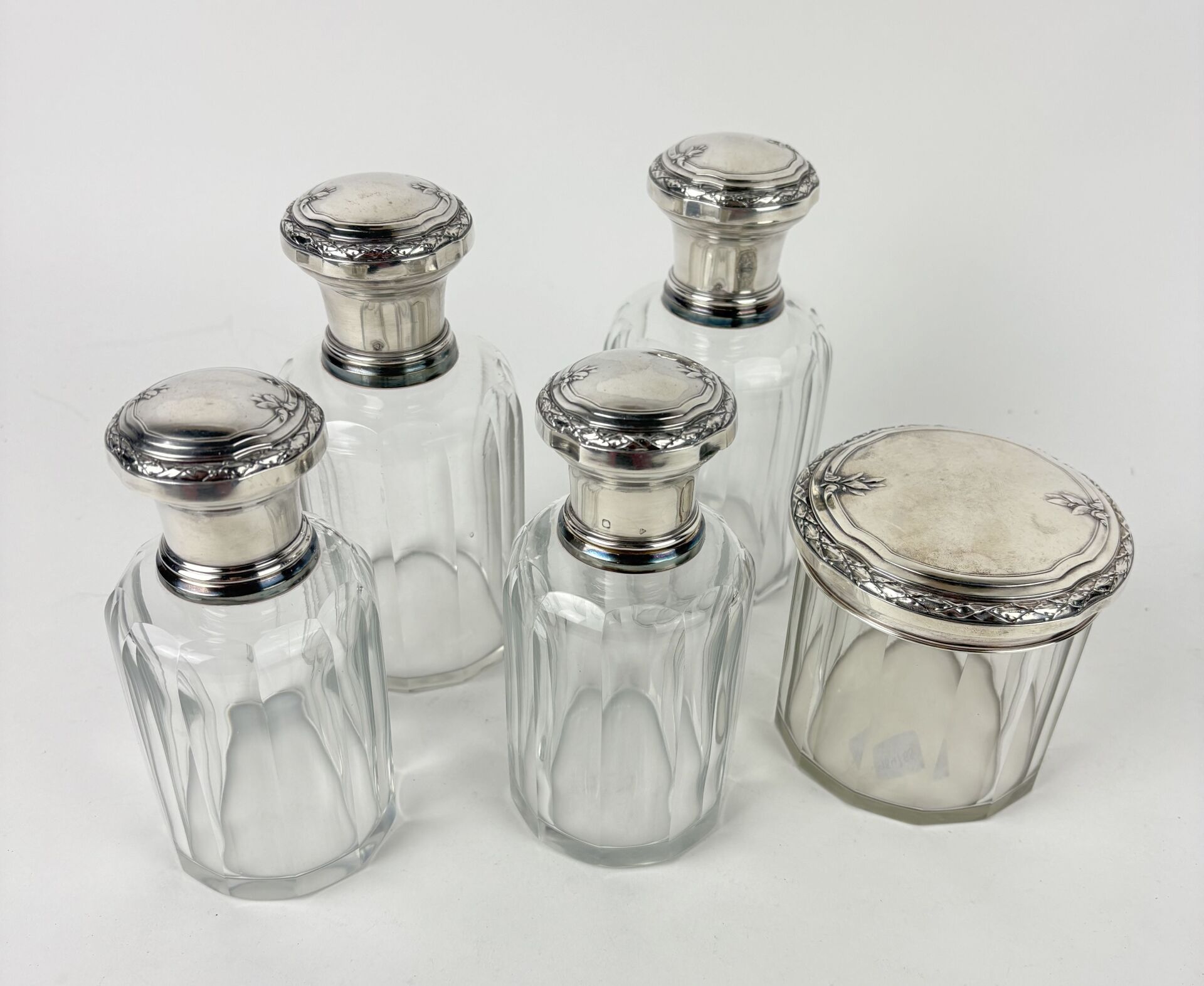 Nécessaire en cristal cotelé, bouchons et montures en argent (925 millièmes), poinçon Minerve comprenant quatre flacons et une boite
