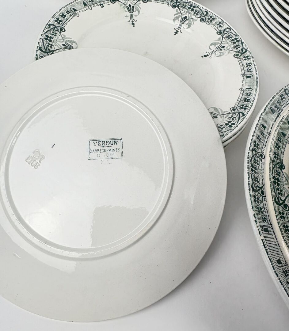 Modèle Verdun – Service de table en terre de fer à décor imprimé vert de fleurs stylisées comprenant :