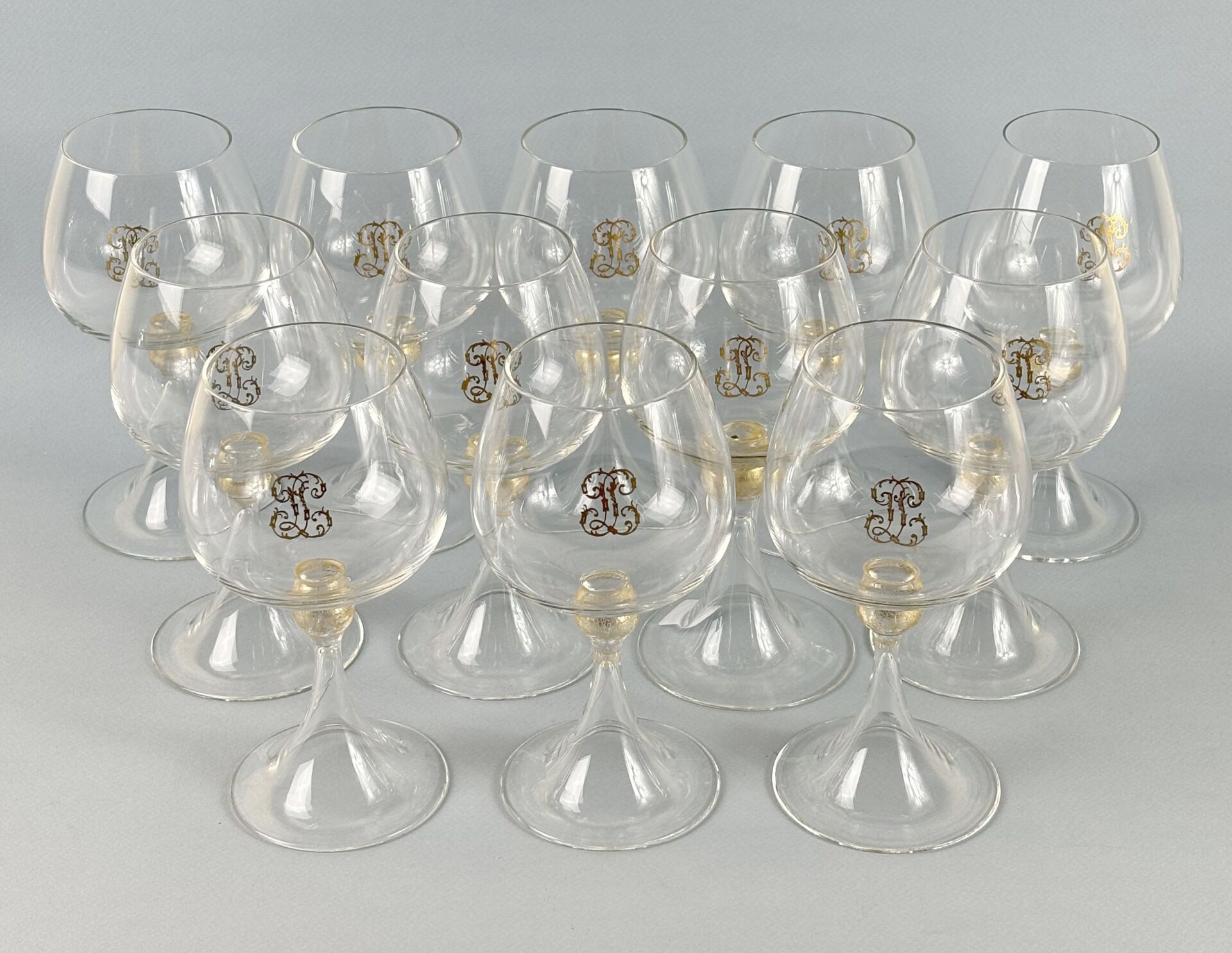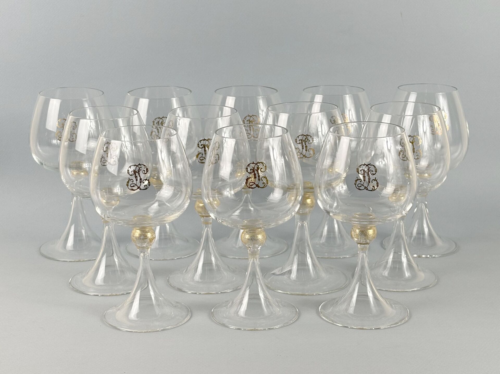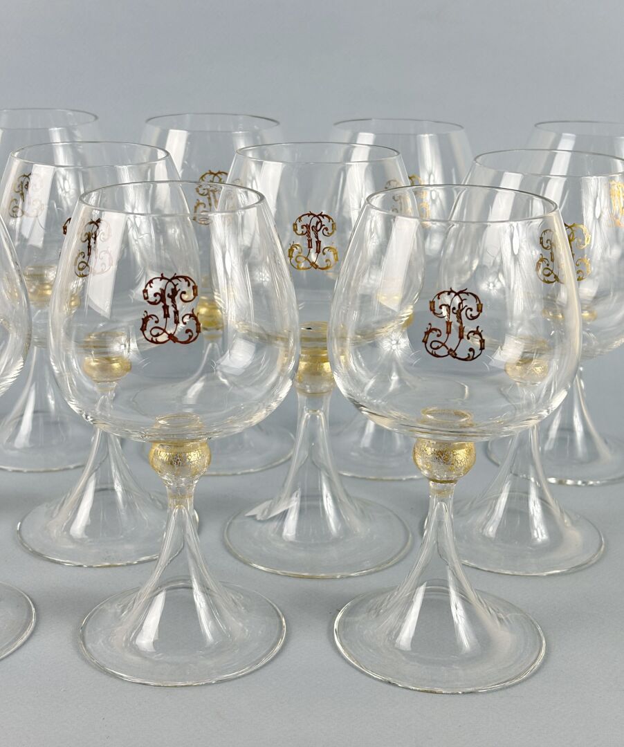 Suite de douze grands verres à vin calice en verre soufflé, la jambe surmontée d’une olive partiellement dorée, chiffrés « JL » en lettres d’or