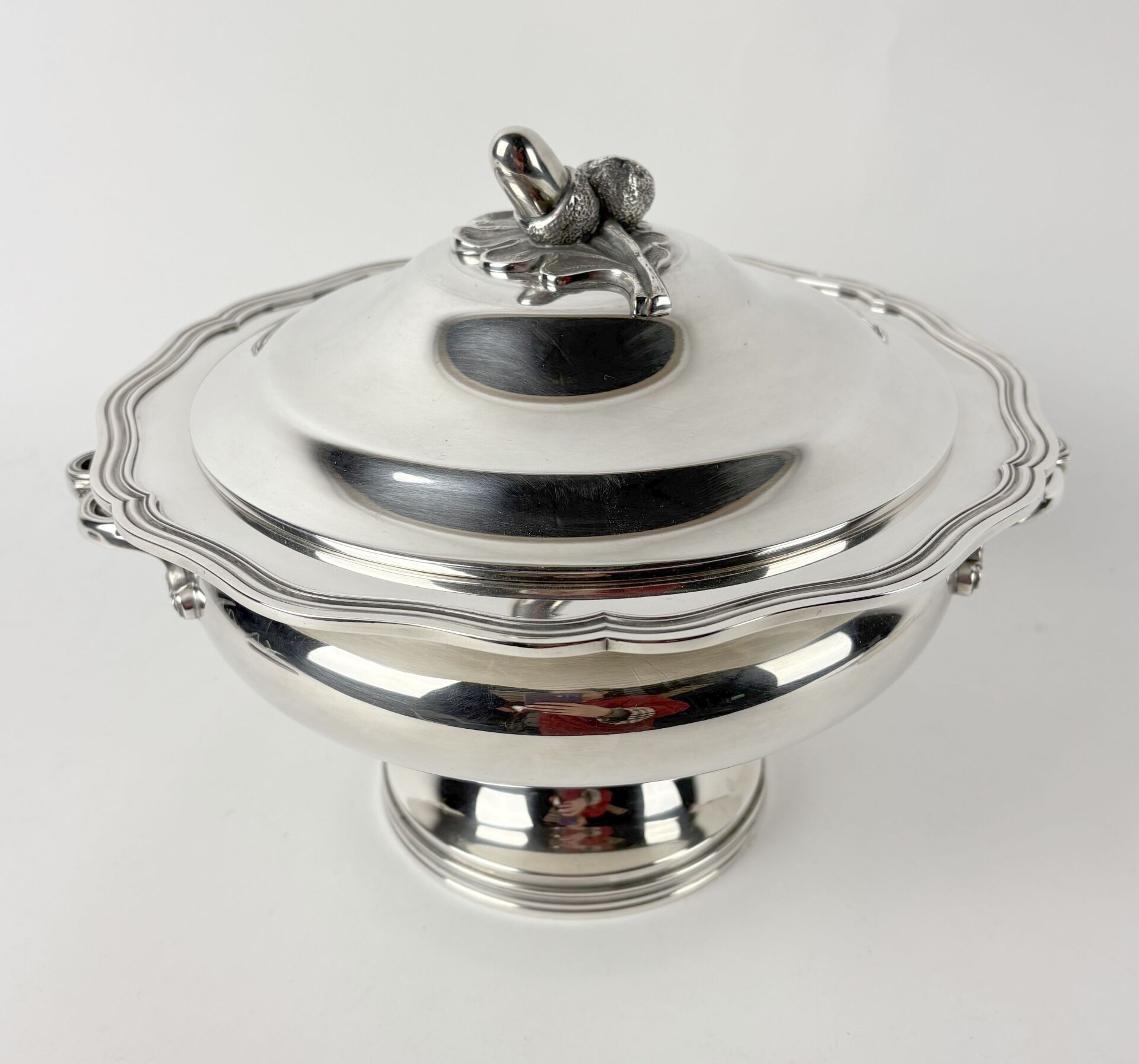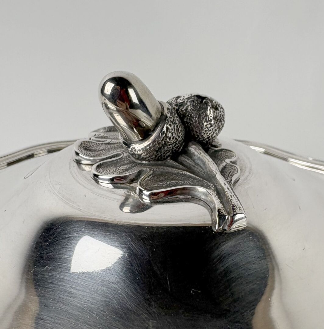 Soupière en métal argenté à bord chantourné, le frêtel à décor de glands