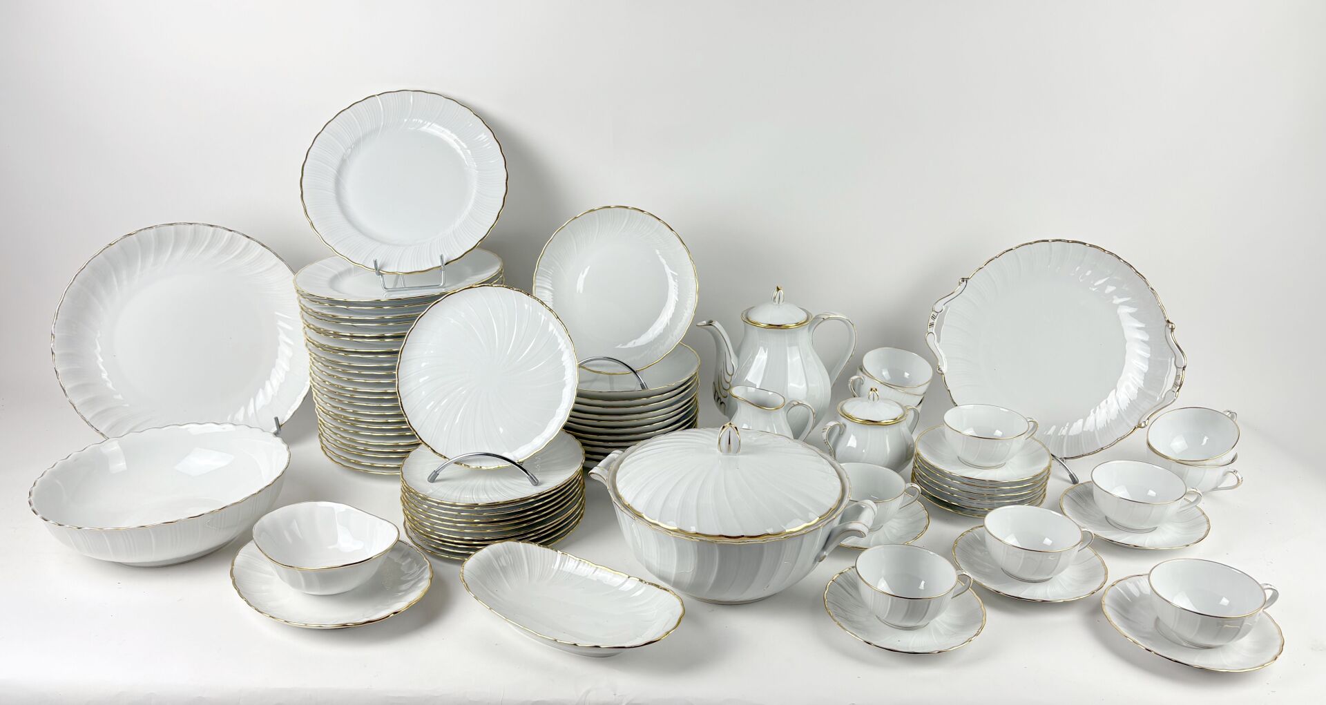 Modèle Verlaine – Partie de service de table en porcelaine blanche et or à décor tournoyant comprenant :