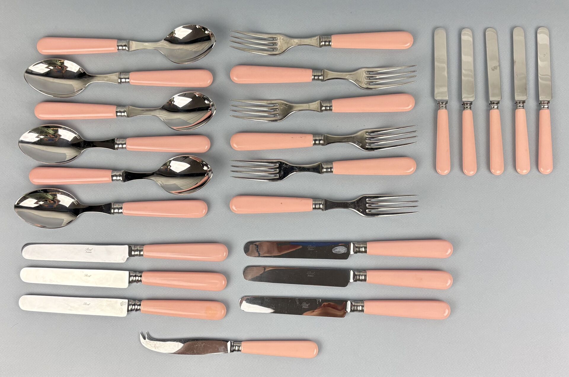 336 ESTIMATION: 20 / 30 € SCOF Partie de ménagère en inox et résine rose comprenant : – 6 Couverts de table – 6 Couteaux de table – 5 Couteaux à fruits – 1 Couteau à fromage
