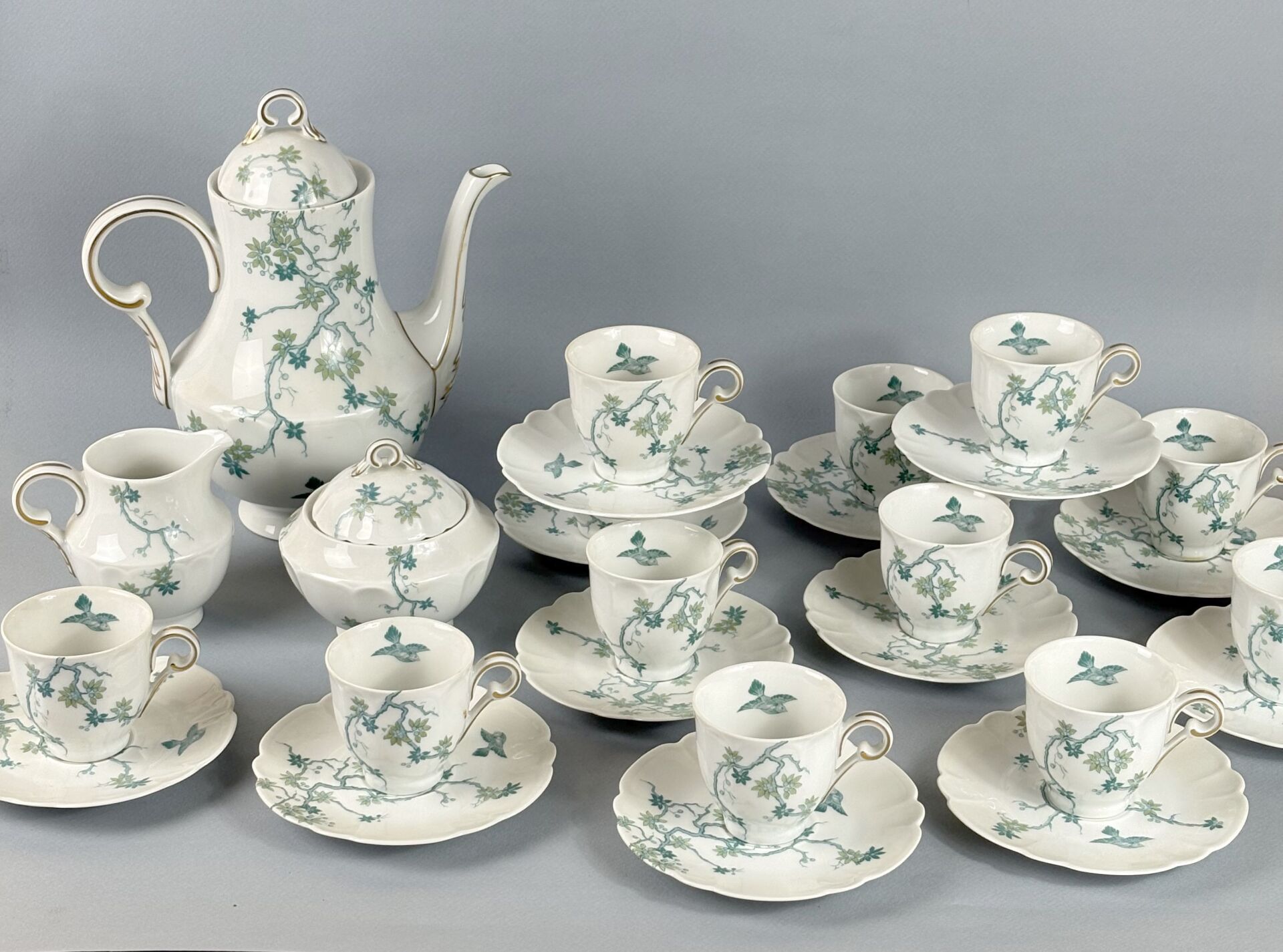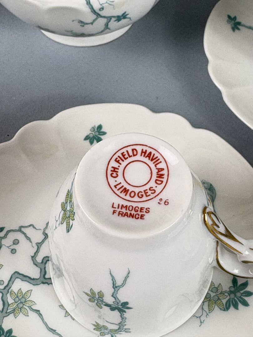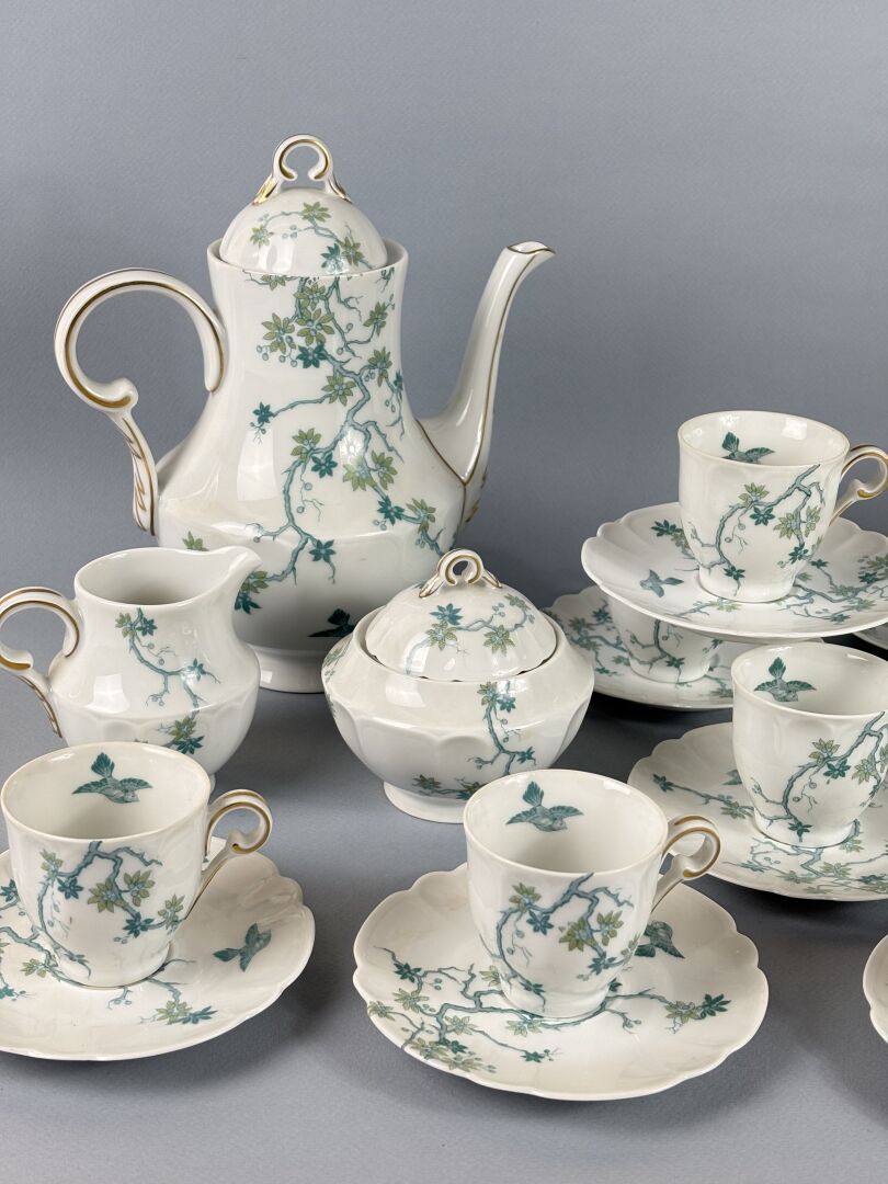 347 ESTIMATION: 60 / 80 € HAVILAND, Limoges Partie de service à café en porcelaine blanche à décor japonisant de cerisiers et d’oiseaux comprenant : – 12 Tasses et leurs sous-tasses – 1 Cafetière – 1 Verseuse – 1 Sucrier