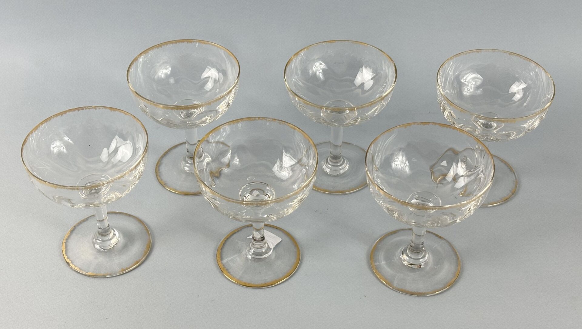 351 ESTIMATION: 60 / 80 € CRISTALLERIE LEGRAS ET COMPAGNIE A SAINT DENIS Suite de six coupes à champagne en cristal godronné, les bords peignés à l’or H : 10.7 cm