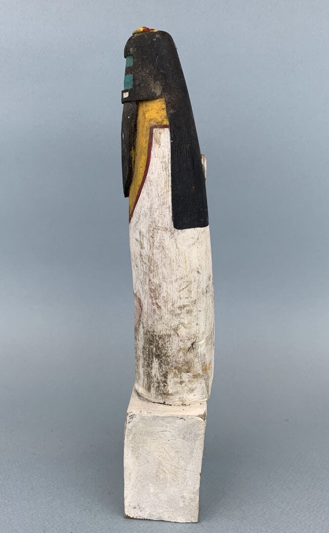 Kachina de commerce présentant les caractères d’une jeune fille Ang-ak-china, avec un masque à fond vert (et non blanc) et un long manteau blanc. Travail probablement Navajo ou mixte.