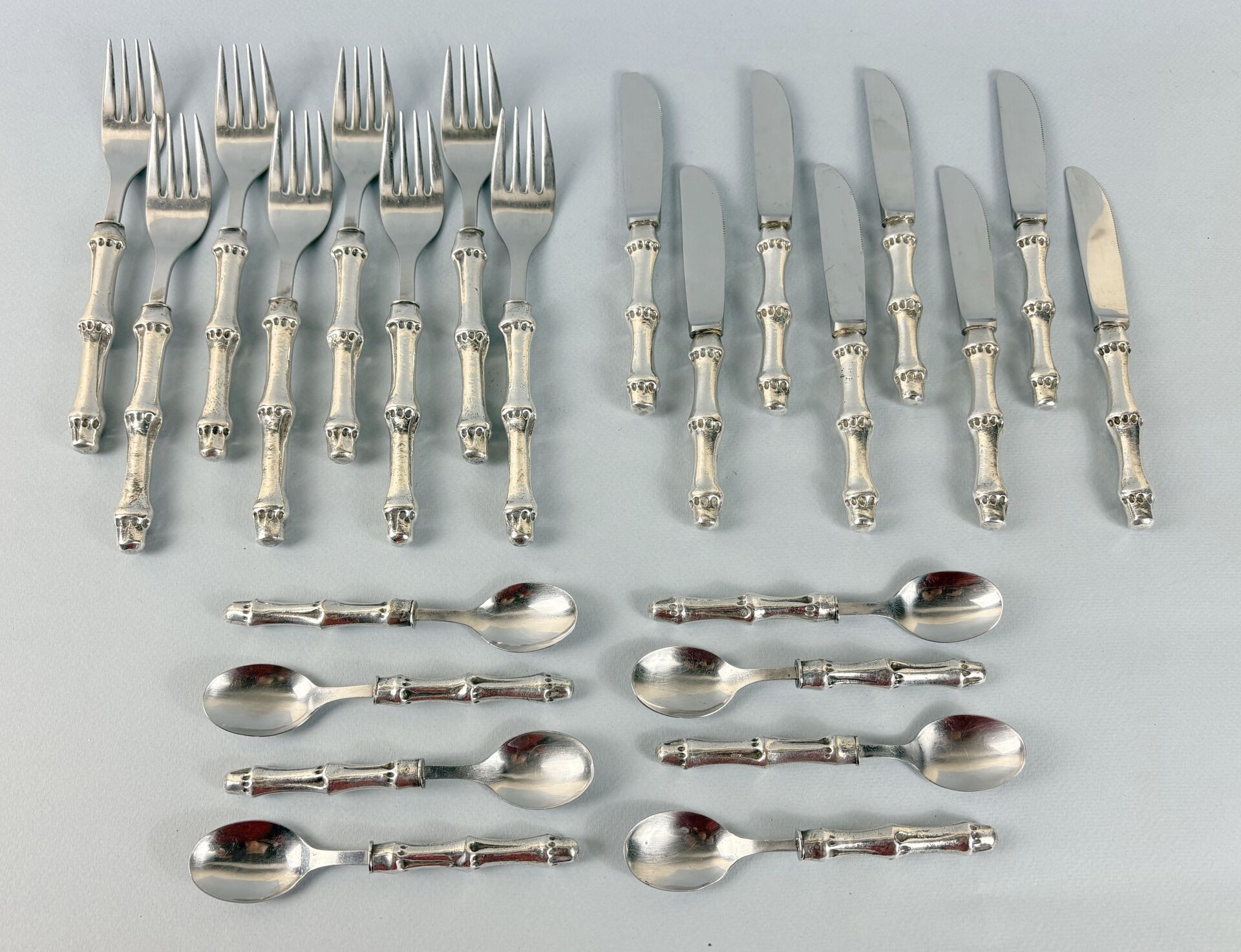 370 ESTIMATION: 100 / 150 € Travail Français des années 70 Partie de ménagère en bronze argenté et inox, les manches figurant des branches de bambou comprenant : – 8 Demi-fourchettes – 8 Tartineurs ou couteaux à fromage – 8 Cuillères à moka