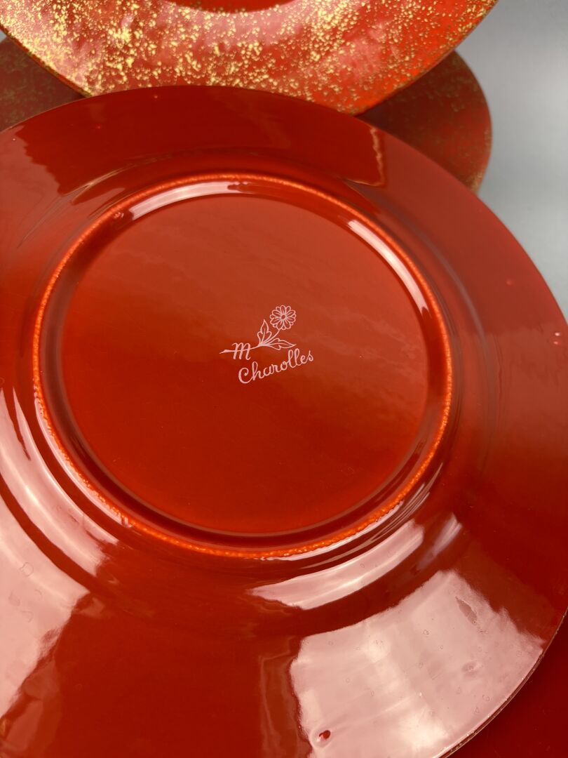 395 ESTIMATION: 80 / 120 € FAIENCERIE DE CHAROLLES Suite de douze assiettes en faïence à engobe corail, le marli à décor moucheté or D : 26.5 cm