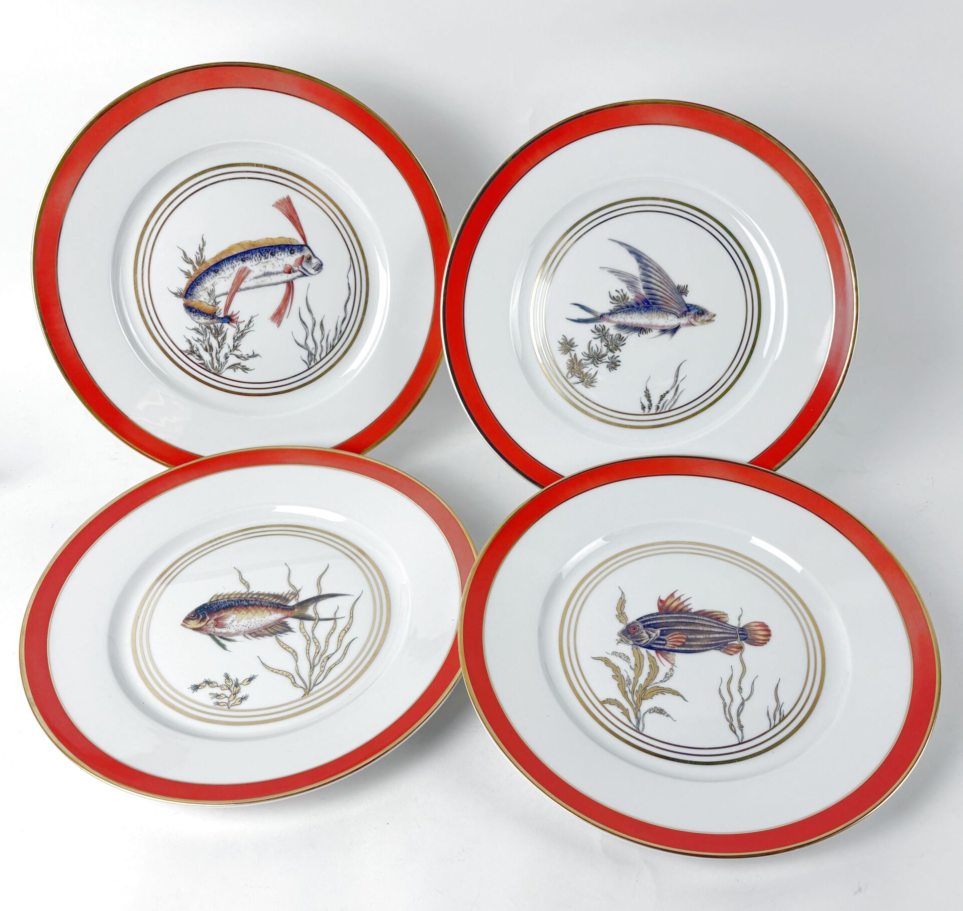Modèle Cristobal (n°4) – Suite de quatre assiettes à poisson en porcelaine à décor polychrome de poissons soulignés de filets corail et doré