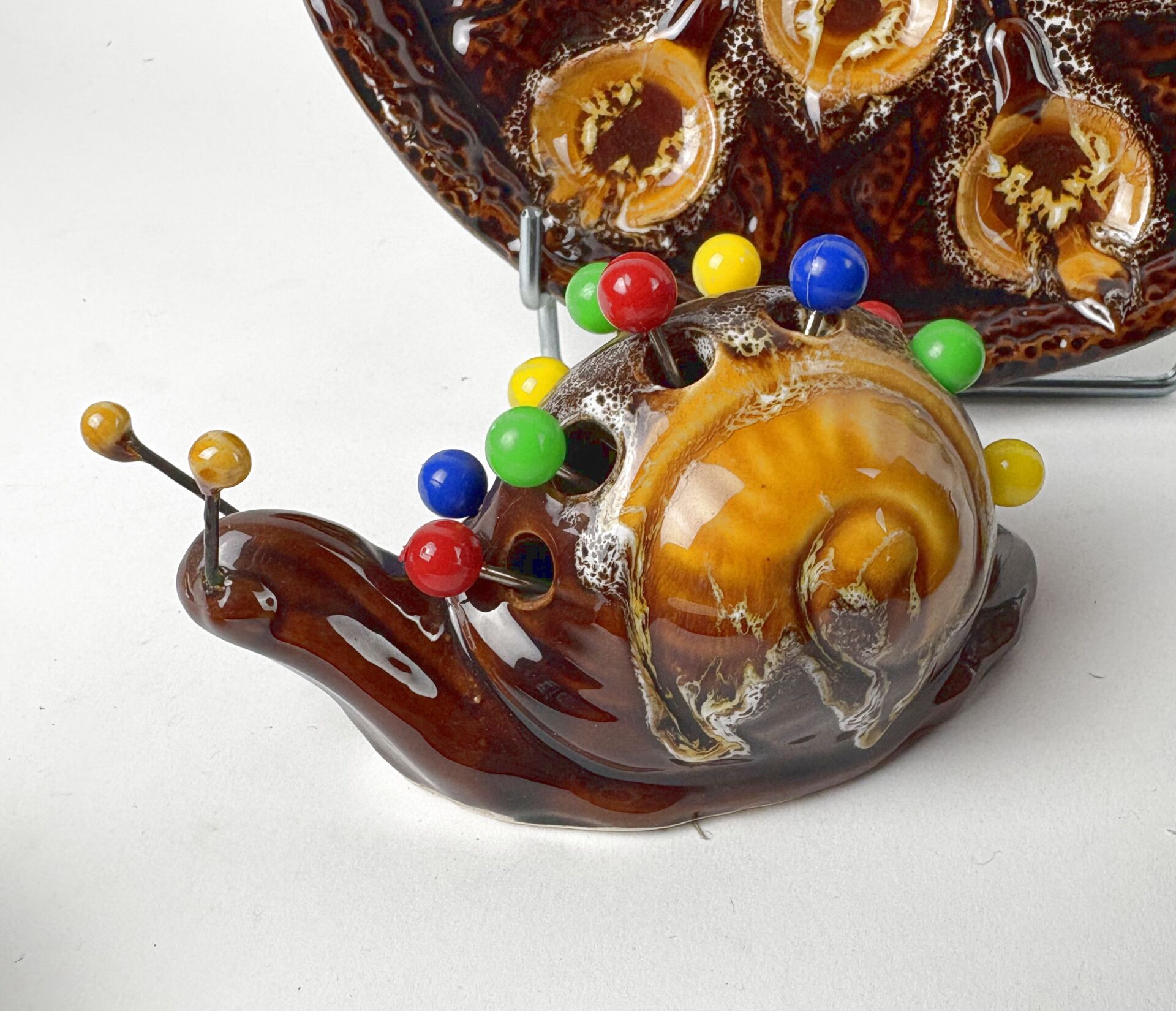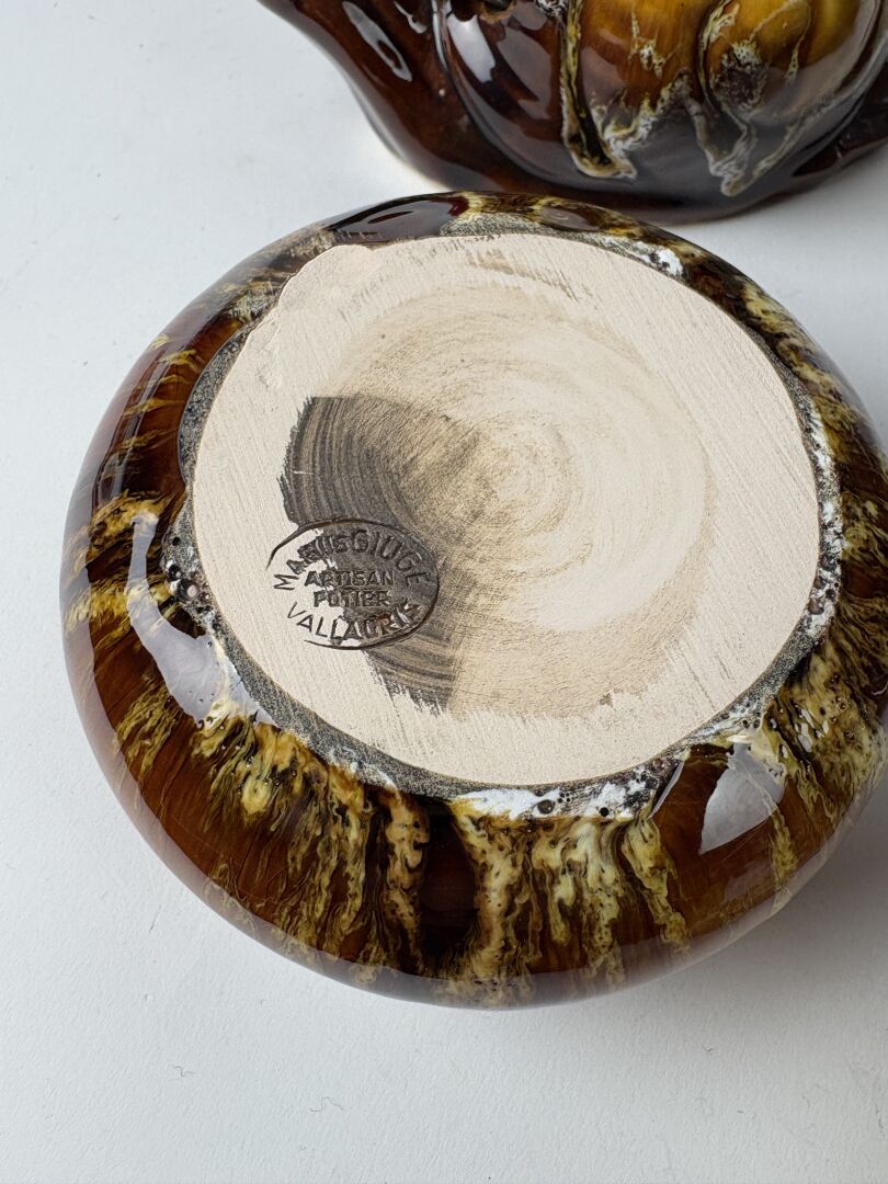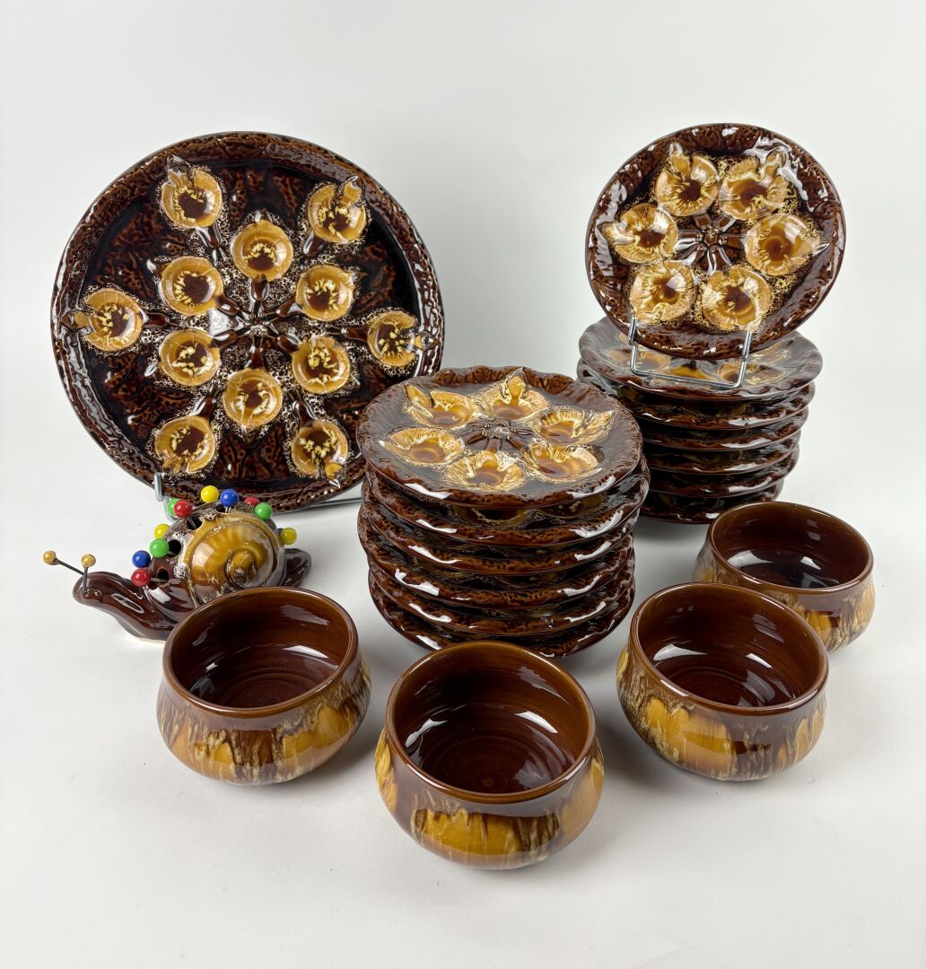 409 ESTIMATION: 100 / 150 € Marius GIUGE, Vallauris Service à escargot en céramique émaillée, comprenant : – 13 Assiettes plates (L : 27cm) – 1 Plat de service – 1 Escargot porte pics (une antenne cassée) – 4 Ramequins