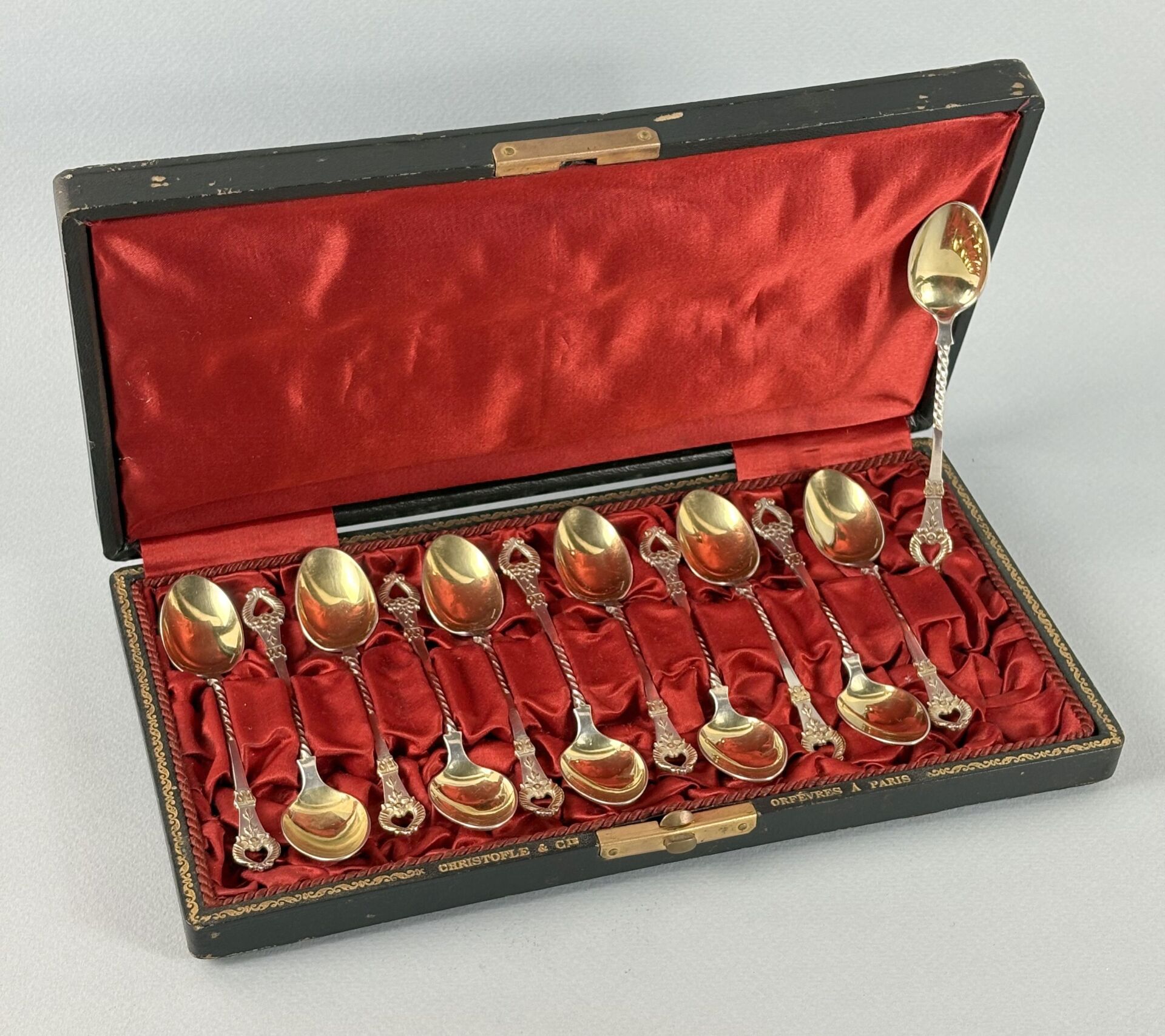 66 ESTIMATION: 60 / 80 € CHRISTOFLE Suite de douze cuillères à moka en métal argenté et doré à décor de style Empire Dans leur écrin d’origine