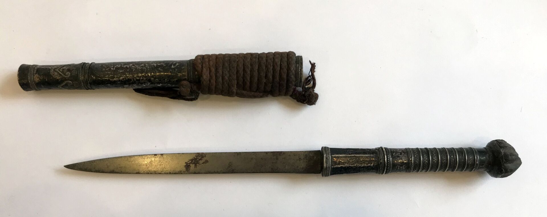 52 RÉSULTAT: 60 € ESTIMATION: 50 / 80 € Dague à lame triangulaire dans un fourreau à âme bois gainé d’argent, belle patine L : 39 cm